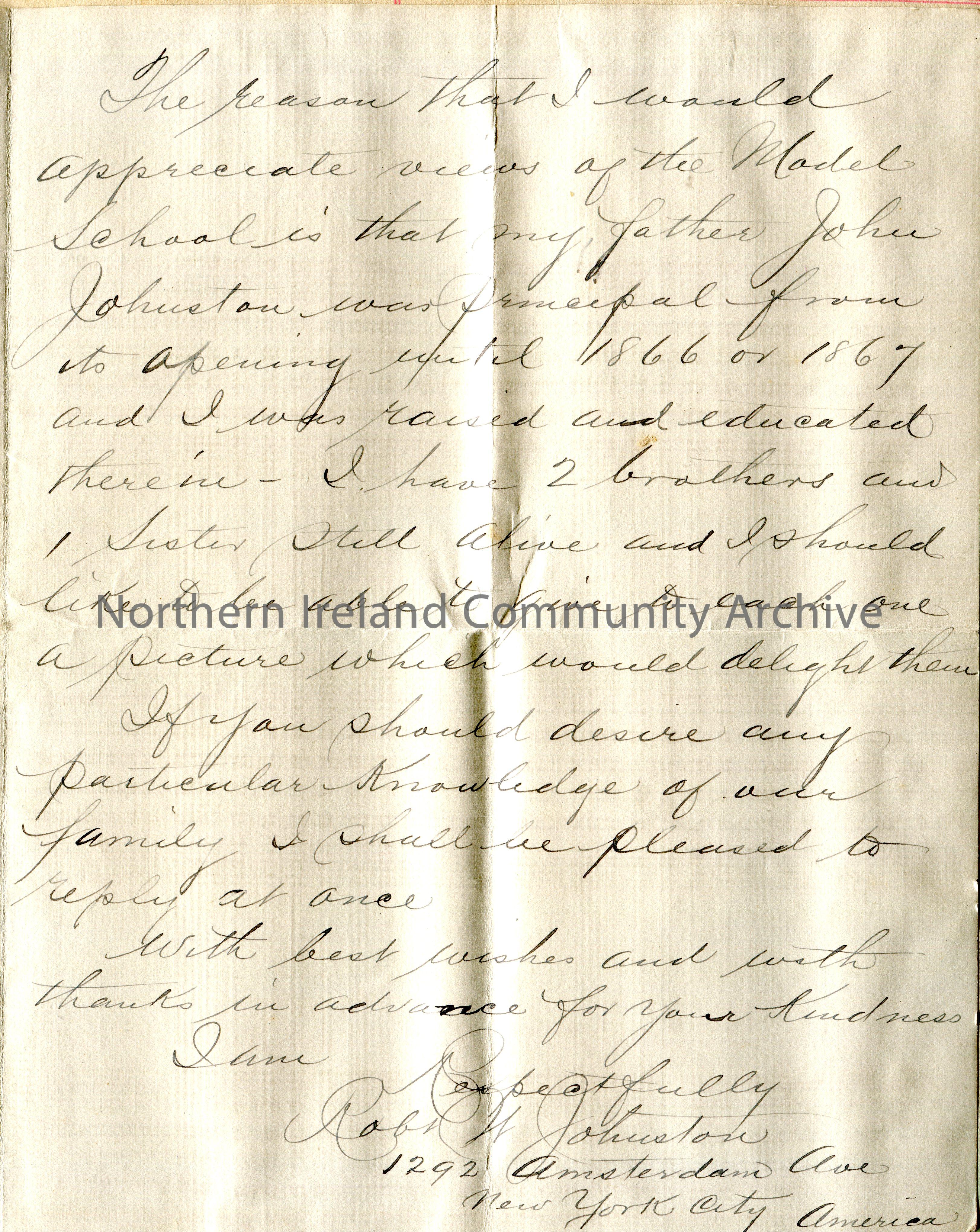 Handwritten letter, pasted to page, to the Principle of the Model School, Coleraine from Robert Johnston. Re exchanging of photographs. Notes that his father, John Johnston, was the first principle of the Model School, until 1866 or 1867. They were also a former pupil of the school.