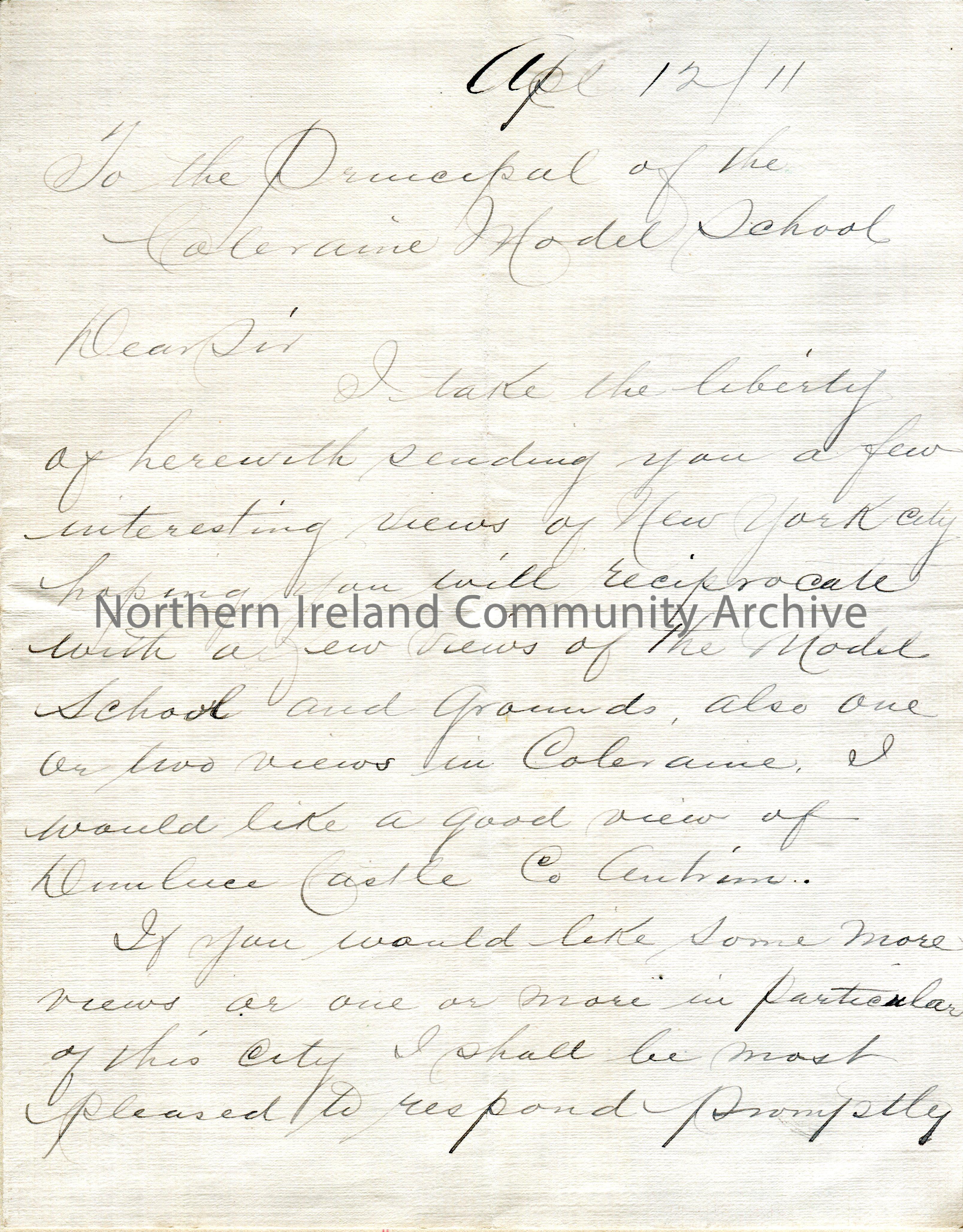 Handwritten letter, pasted to page, to the Principle of the Model School, Coleraine from Robert Johnston. Re exchanging of photographs. Notes that his…