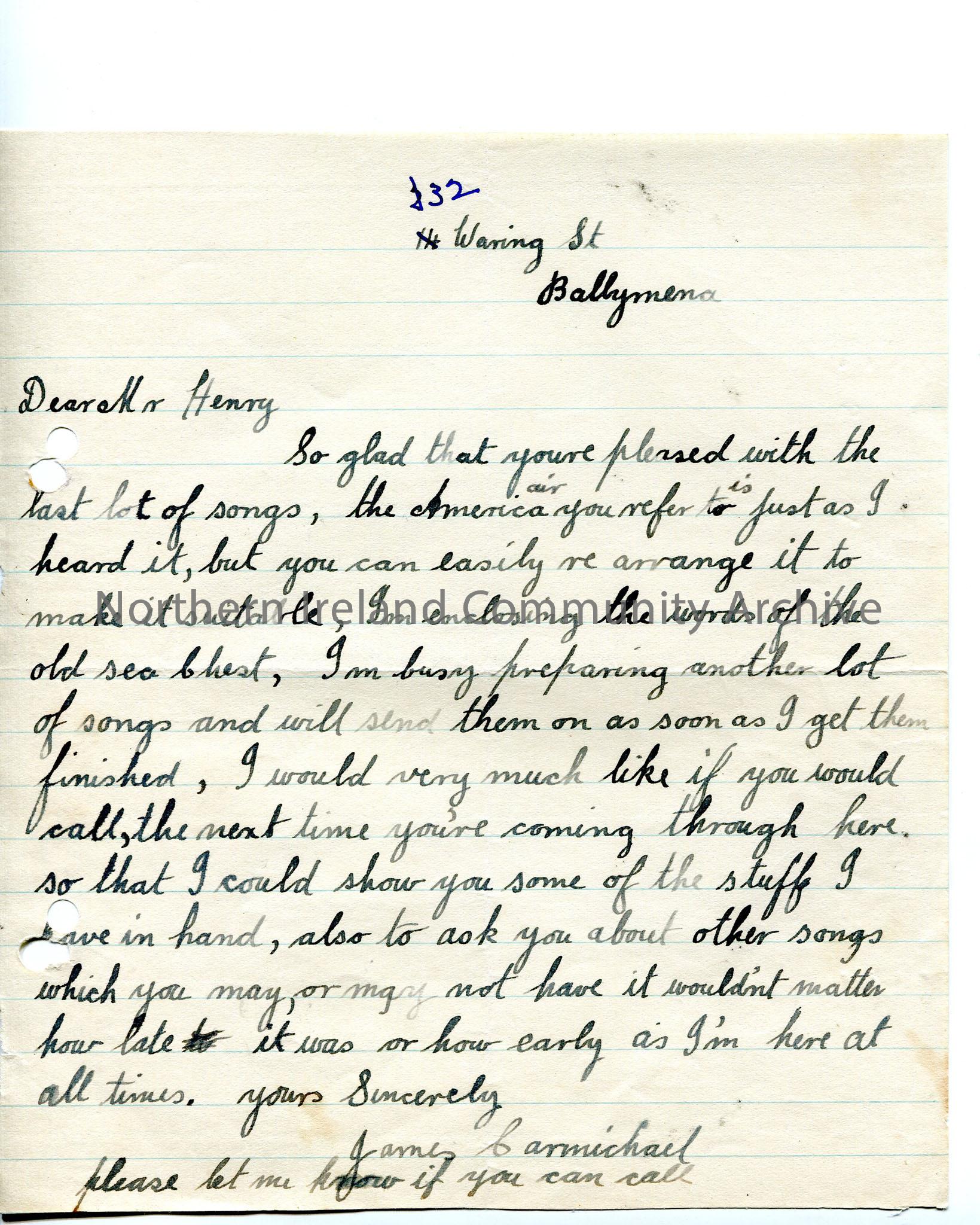 Handwritten letter re collecting of songs and asking if Sam will call with him