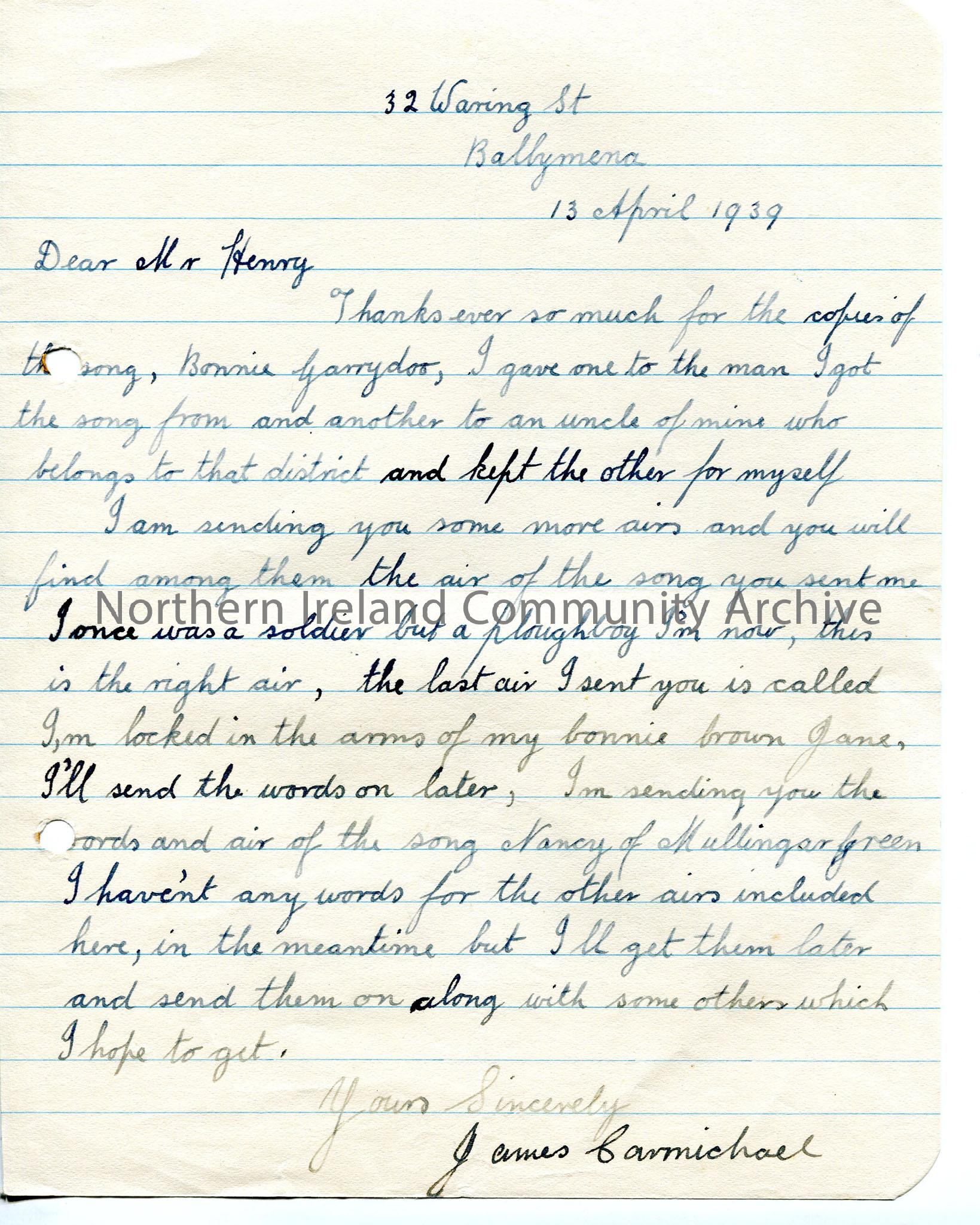 Handwritten letter re collecting of songs and thanking Sam for song received from him.