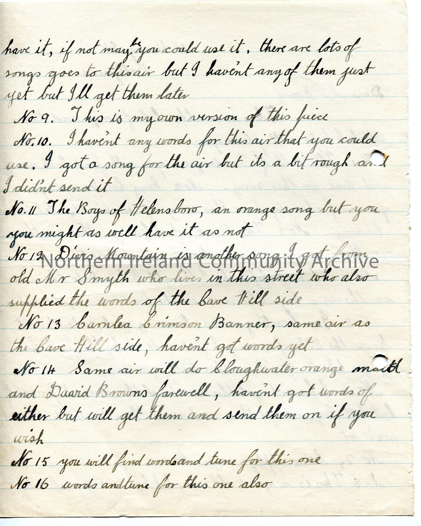 Handwritten letter re collection of songs for Sam Henry, with notes on the songs he is sending with this letter – stops at No.16, with no signature – … – img895
