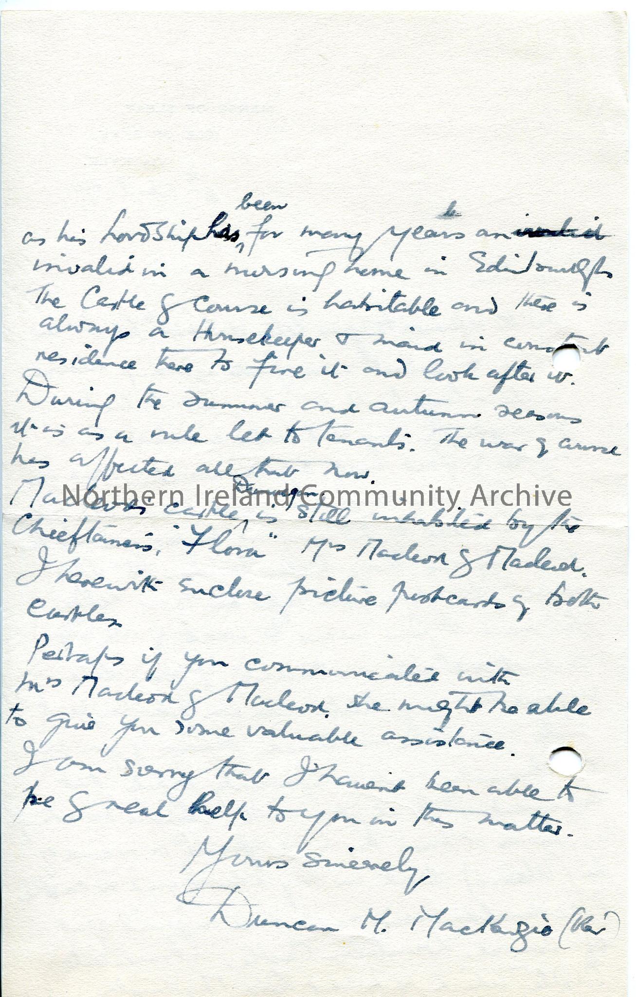 Handwritten letter re information on Rory Dall O’Cahan, the likelihood of 1 or 2 Rory Dalls in the Scottish Isles and the harpers of the MacDonalds an… – img430