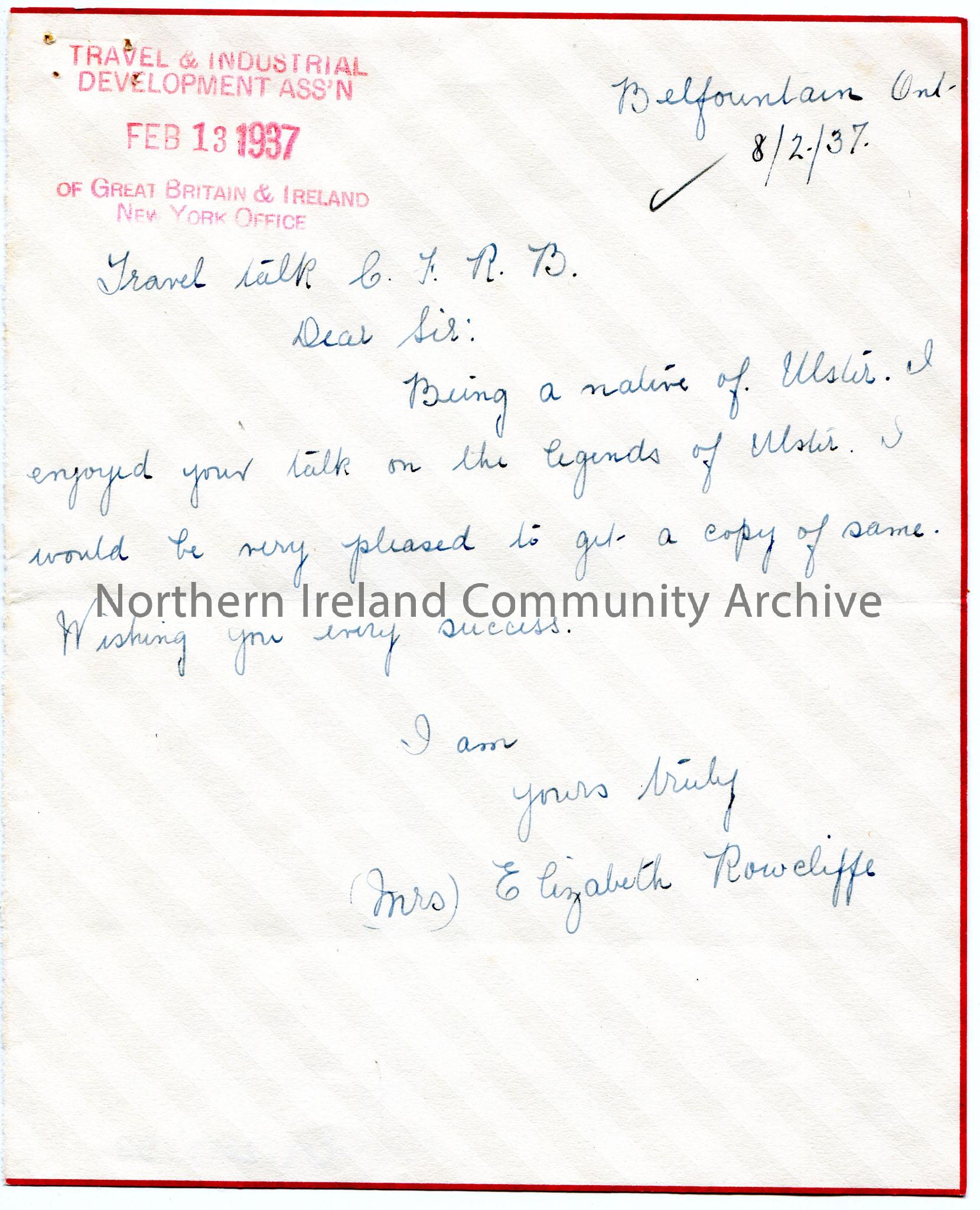 Handwritten letter re Travel talk broadcast over CFRB radio. Dated 8th February, 1937. Asks for a copy of the legends of Ulster talk as they are a native of Ulster. Stamped Travel & Tourism Development Ass'n, 13th February, 1937, of Great Britain & Ireland New York Office.