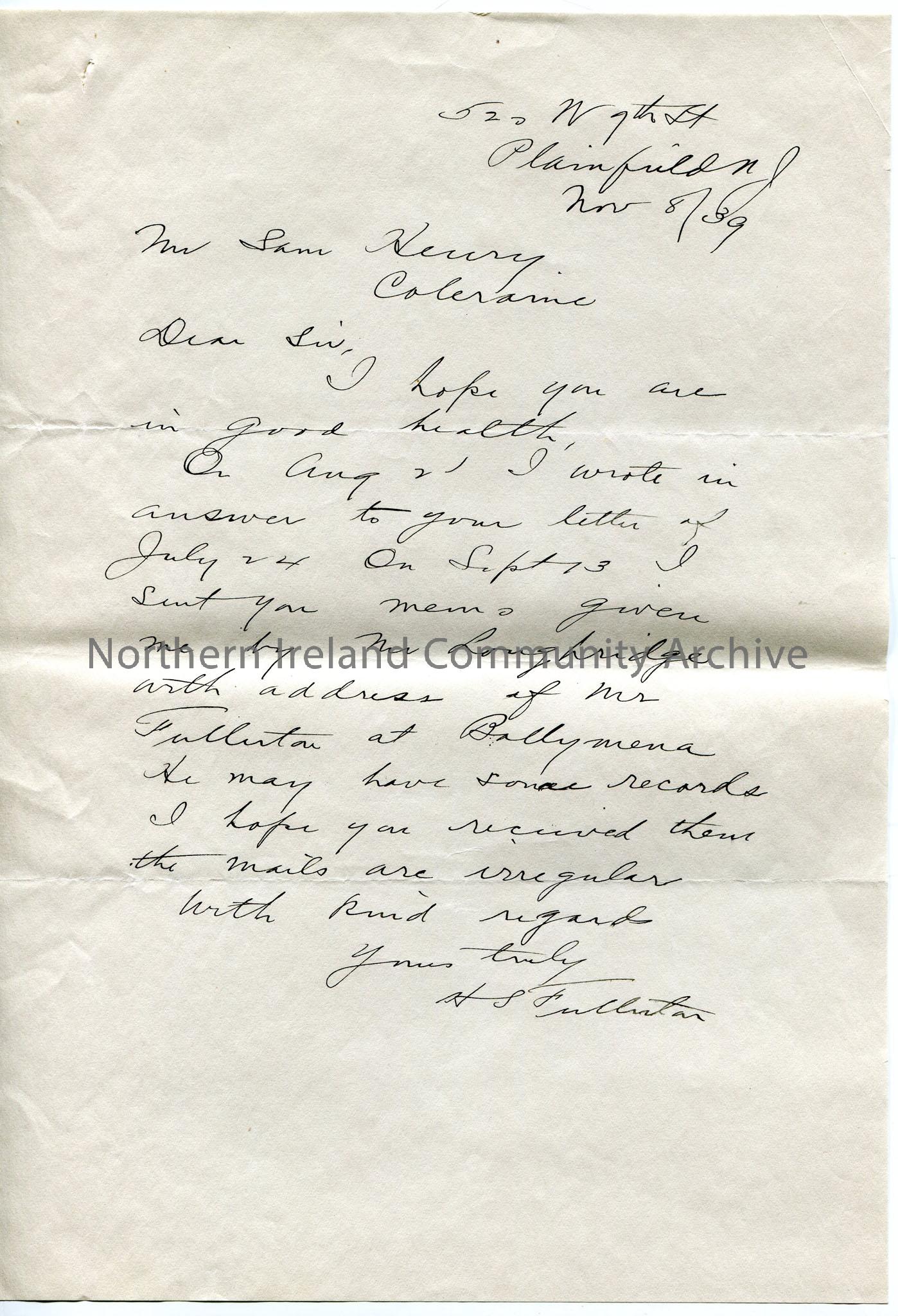 Handwritten letter. Refers to letters already sent, including again the memo from Loughridge with Fullerton Ballymena address - worried re post not arriving