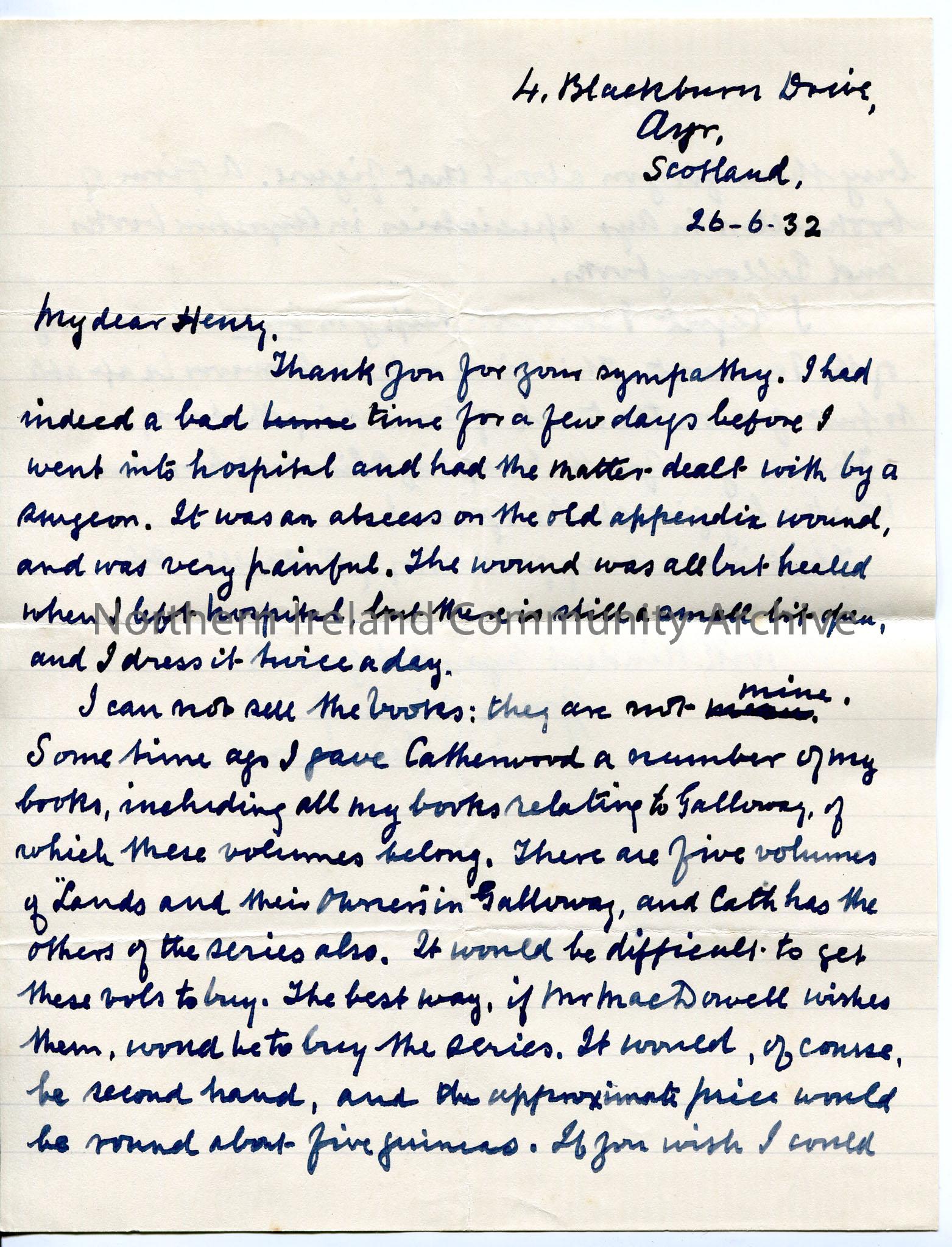 Handwritten letter relating to search and purchase of books on Ayrshire and Galloway landowners. Cannot help with Tennant research.
