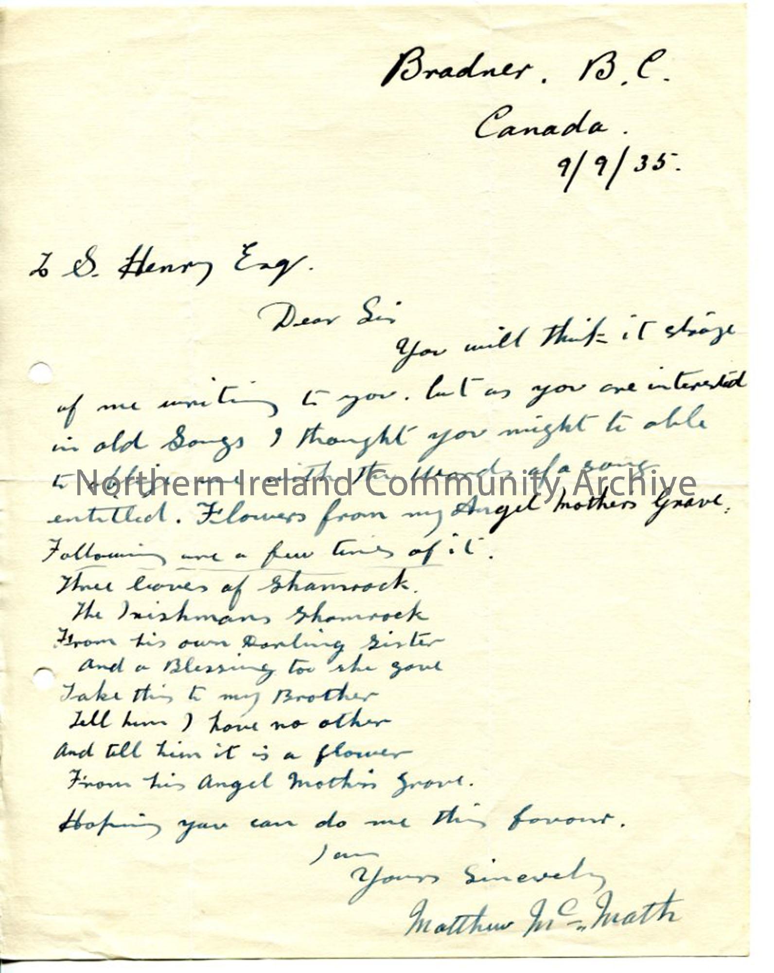 Handwritten letter requesting help with words to the song 'Flowers From my Angel Mother's Grave', with the few lines author does know. Author McMath, Matthew.