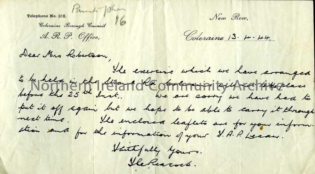 Handwritten letter sent to Mrs R. Robertson from ? Peacock, on behalf of the A.R.P Office of Coleraine Borough Council and dated 13th April 1944. Letter states that the exercise organised for Strand Road has to be put off until after 25th.