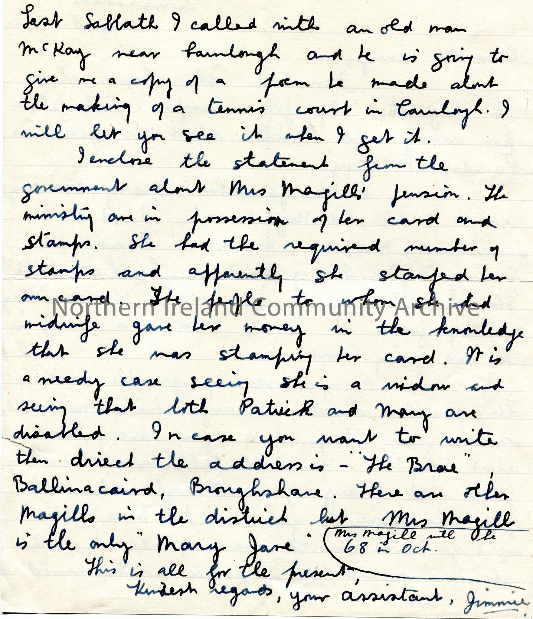 Handwritten letter signed 'your assistant, Jimmie' to Sam Henry, address from Loughloughan, Broughshane, dated Aug 8 1940. Jimmie refers to various songs sung by Mary. Mentions fiddler Sam Robinson. Talks about Mrs Magill's pension.
