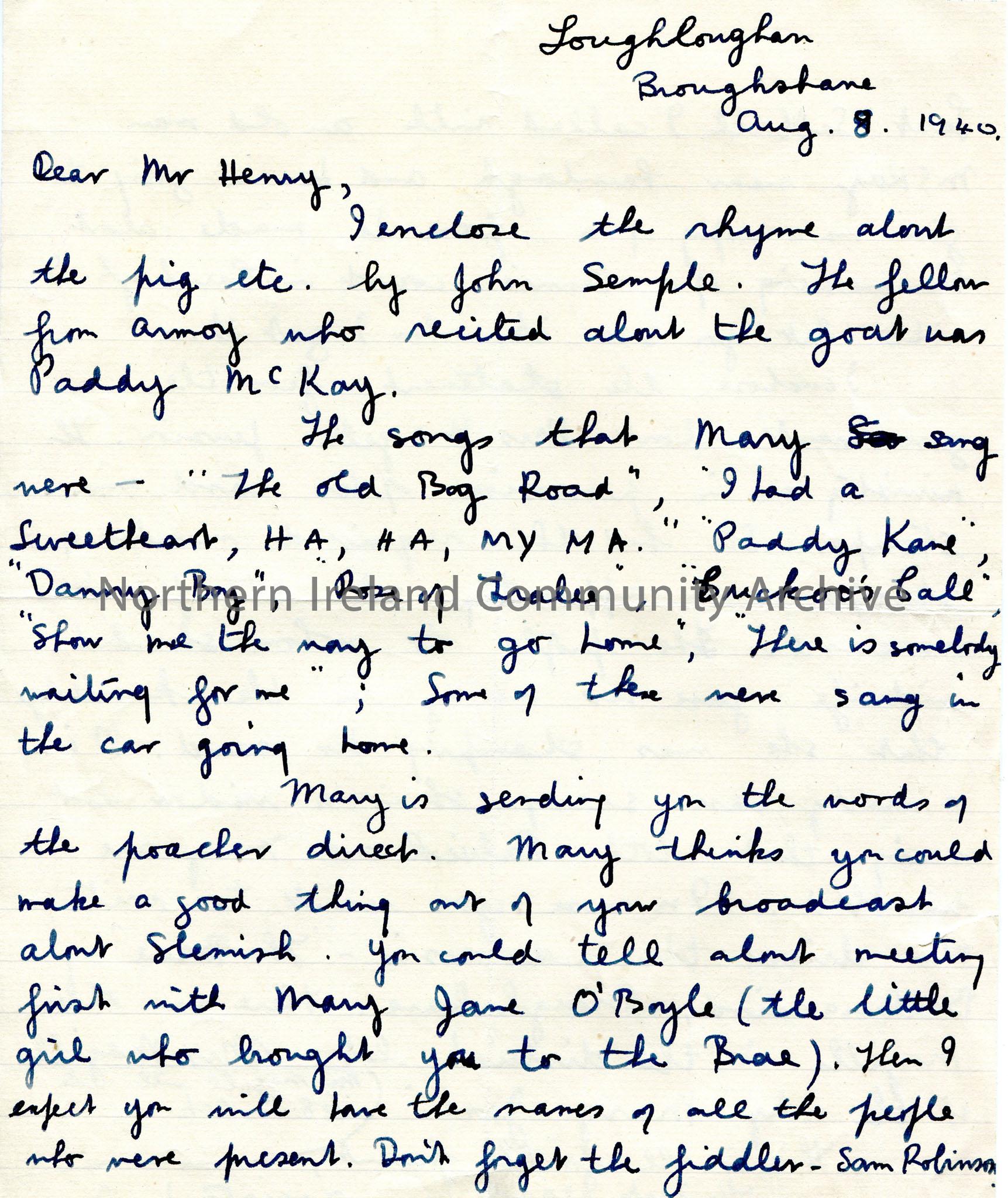 Handwritten letter signed 'your assistant, Jimmie' to Sam Henry, address from Loughloughan, Broughshane, dated Aug 8 1940. Jimmie refers to various songs sung by Mary. Mentions fiddler Sam Robinson. Talks about Mrs Magill's pension.