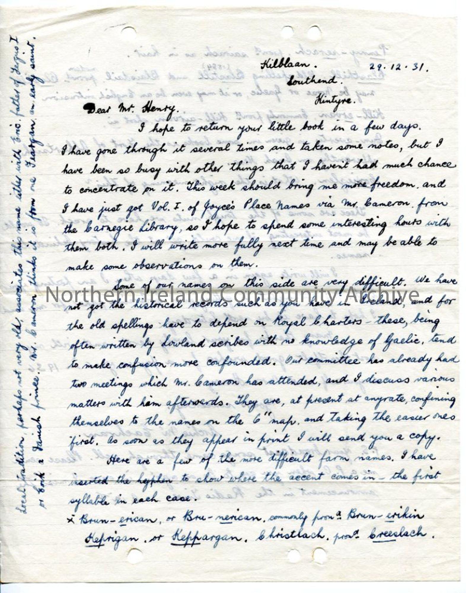 Handwritten letter. Talks of committee work re names and spelling problems for old names in Scotland – not many records and old names on Royal Charter…