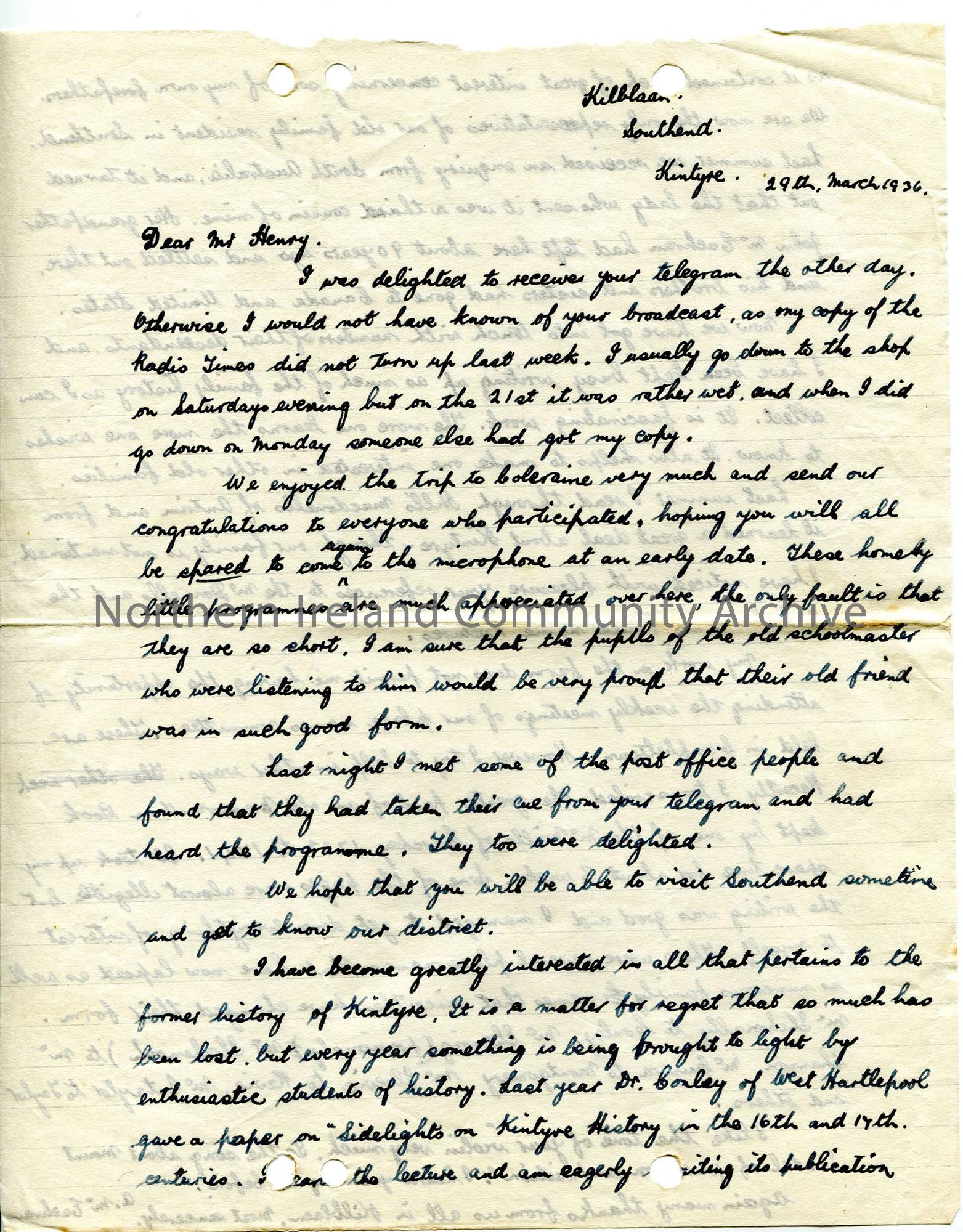 Handwritten letter – talks of ‘trip to Coleraine’ but is referring to Sam’s broadcast bringing it alive for them. Mentions local history publications,…