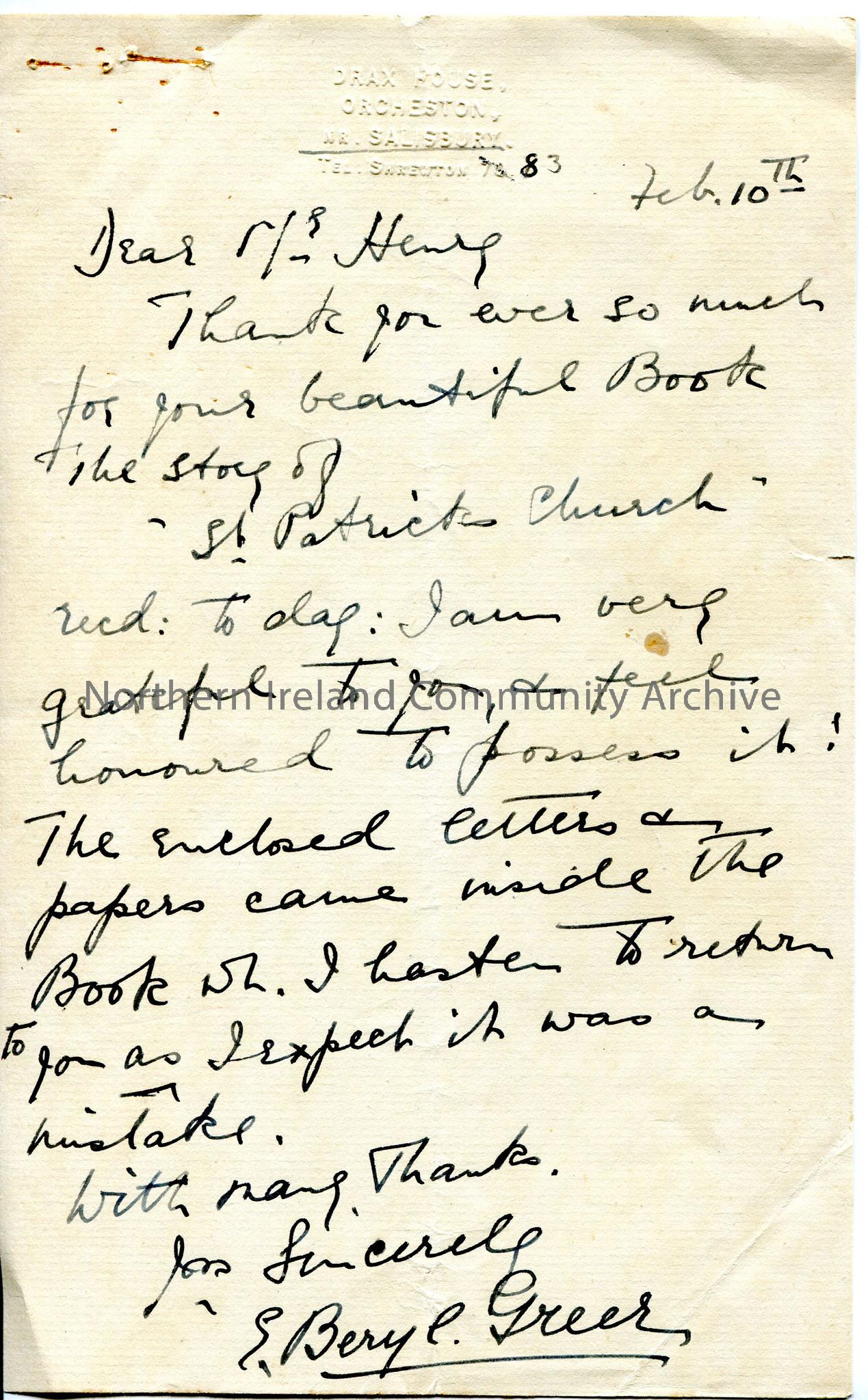 Handwritten letter thanking Sam for book on St Patrick’s Church.
