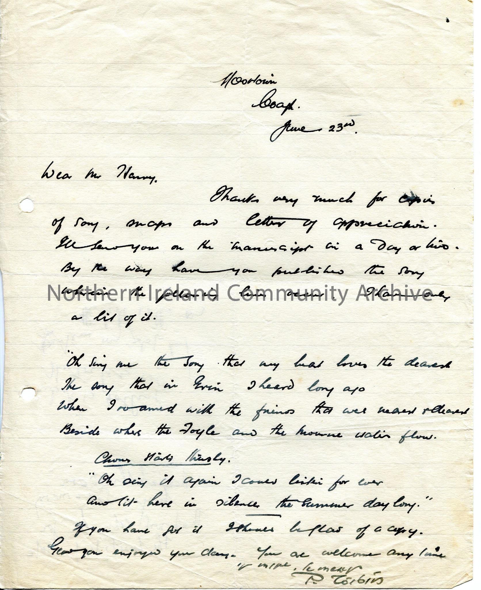 Handwritten letter thanking Sam for son, snaps and letter and giving some lines of song