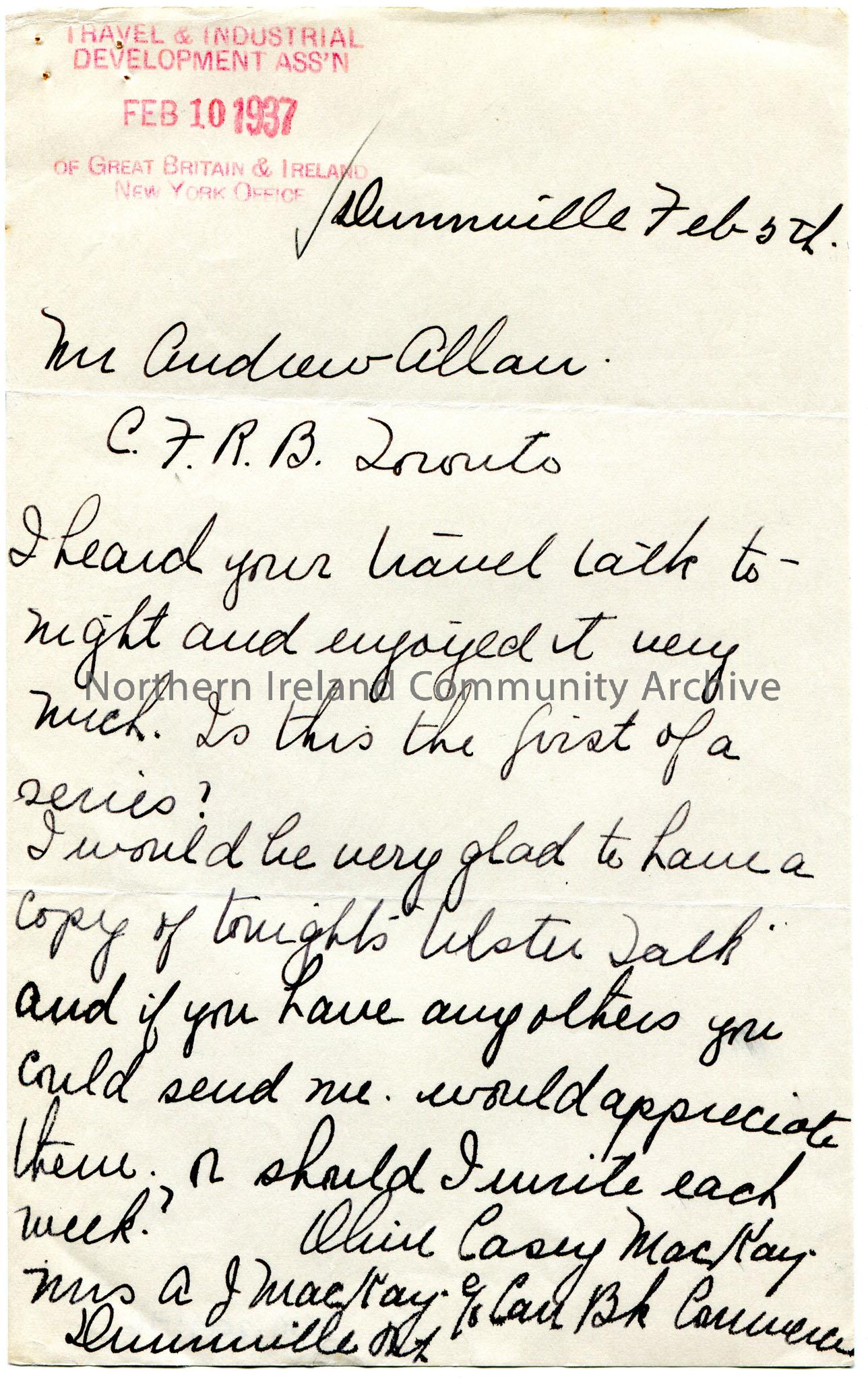 Handwritten letter to Andrew Allan of CFRB Toronto, dated 5th February. Asking if the Travel talk on Ulster will be the first of a series. Would like a copy of the talk and any others to sent also. Stamped Travel & Tourism Development Ass'n, 10th February, 1937, of Great Britain & Ireland New York Office.