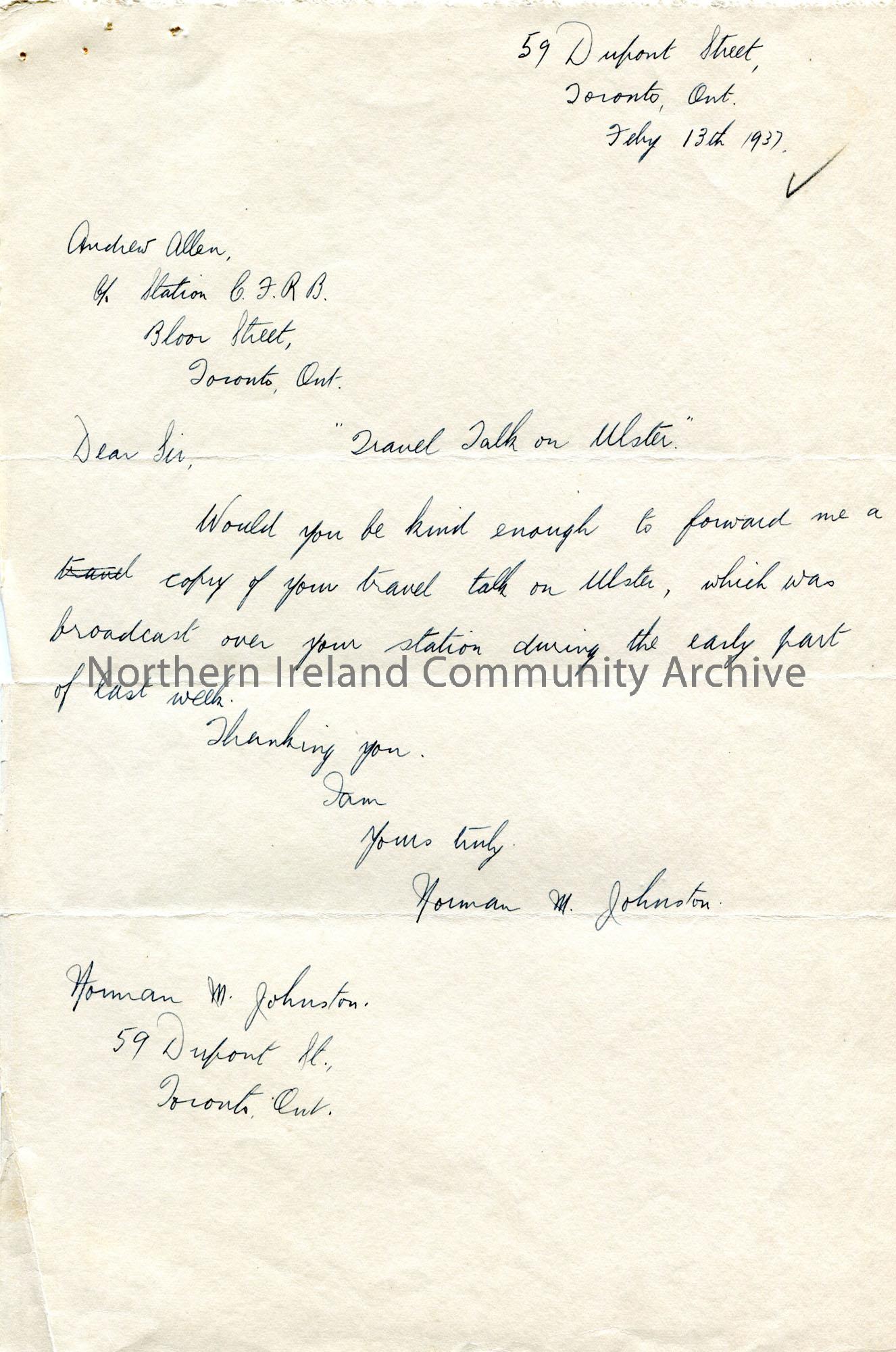 Handwritten letter to Andrew Allen of Radio Station C.F.R.B. Toronto from Norman M Johnston. Requesting a copy of a travel talk on Ulster broadcast on the station recently.