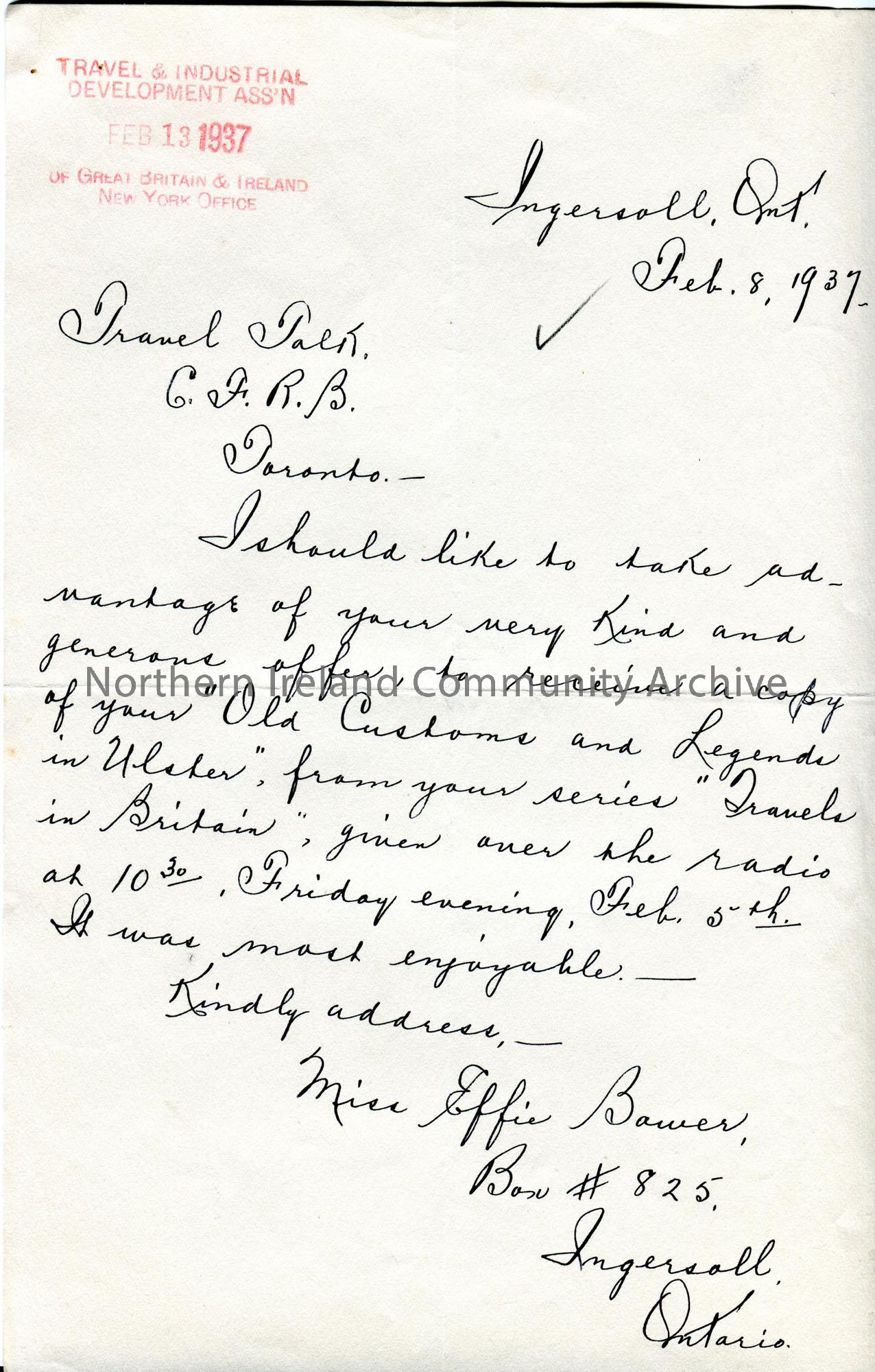 Handwritten letter to C.F.R.B. radio station from Miss Effie Bower. Requests a copy of talk 'Old Customs and Legends of Ulster' from the series 'Travels in Britain' given on 5th February 1937.