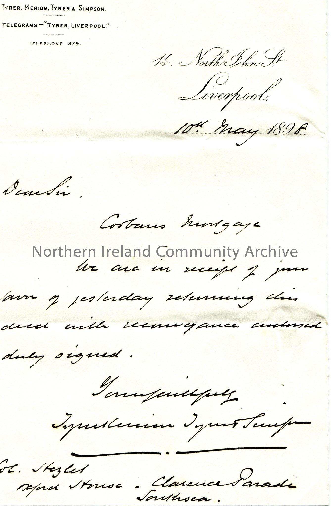 Handwritten letter to Col. Hezlet at Deford? House, Clarence Parade, Southsea re Coolan’s mortgage. Re conveyance has been signed by Col. Hezlet.