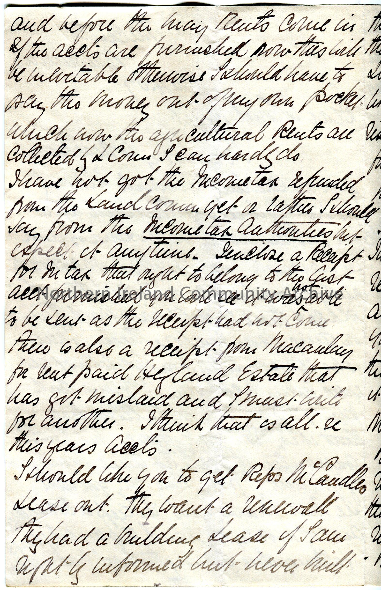 Handwritten letter to Colonel Hezlet (folded and written on four sides). Writing re Colonel Hezlet’s accounts re renting of property. Expecting a tax … – scan011b