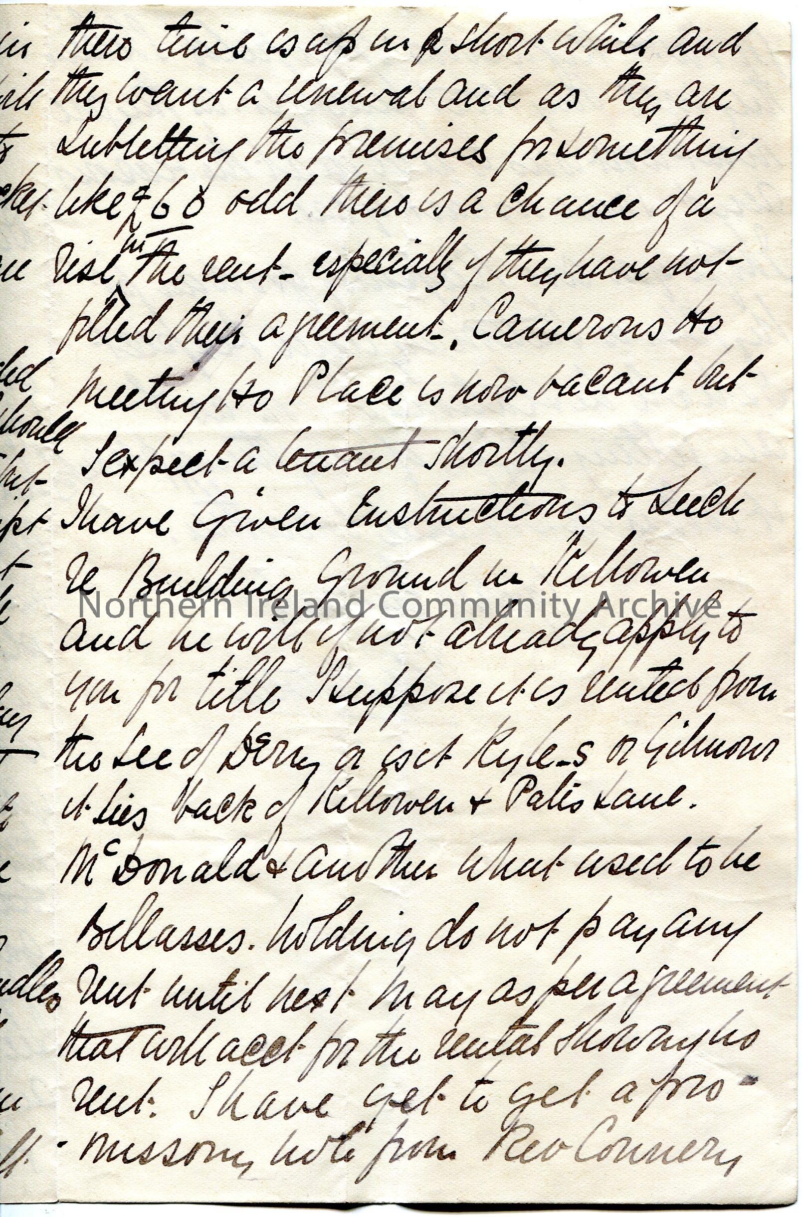 Handwritten letter to Colonel Hezlet (folded and written on four sides). Writing re Colonel Hezlet’s accounts re renting of property. Expecting a tax … – scan011c