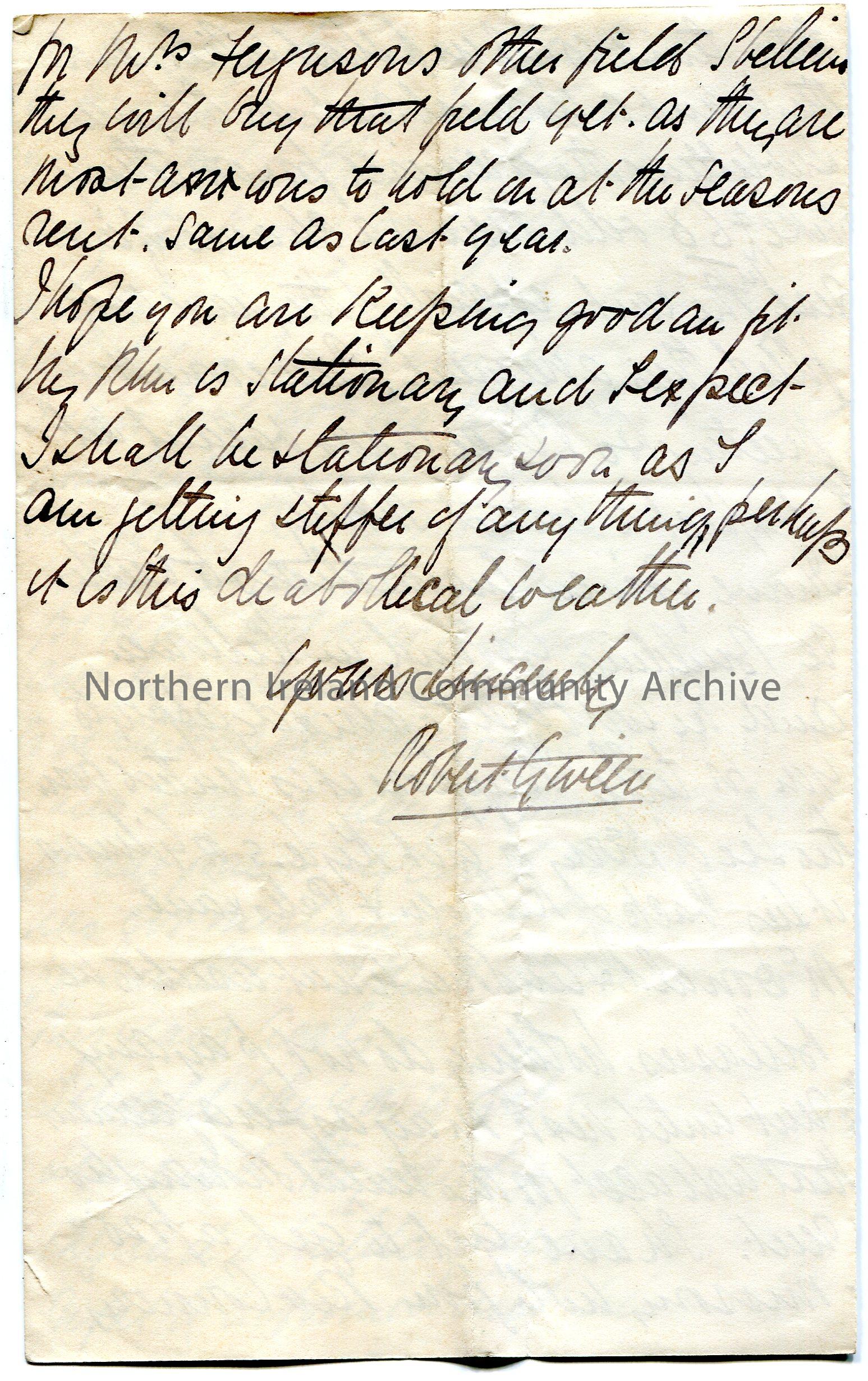 Handwritten letter to Colonel Hezlet (folded and written on four sides). Writing re Colonel Hezlet’s accounts re renting of property. Expecting a tax … – scan011d