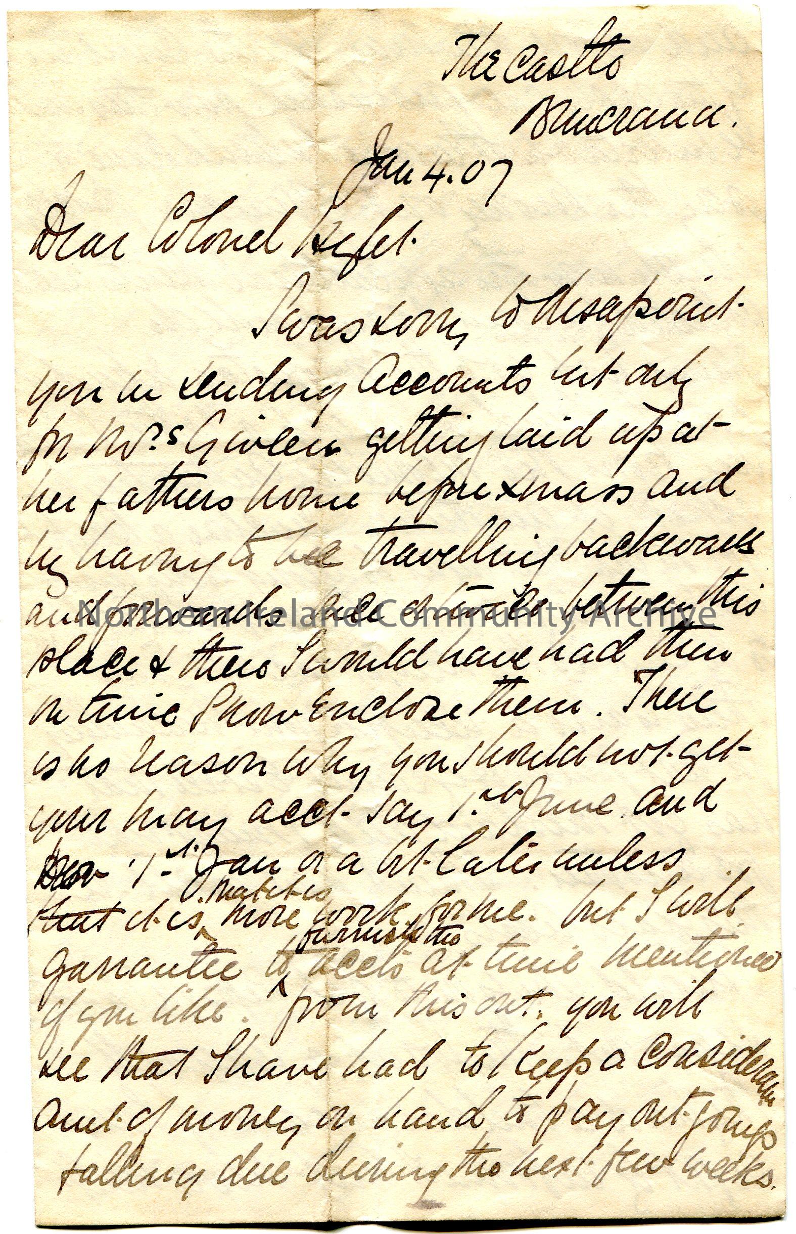 Handwritten letter to Colonel Hezlet (folded and written on four sides). Writing re Colonel Hezlet's accounts re renting of property. Expecting a tax refund from the Land Commission. Mentions Killowen and Pates Lane.