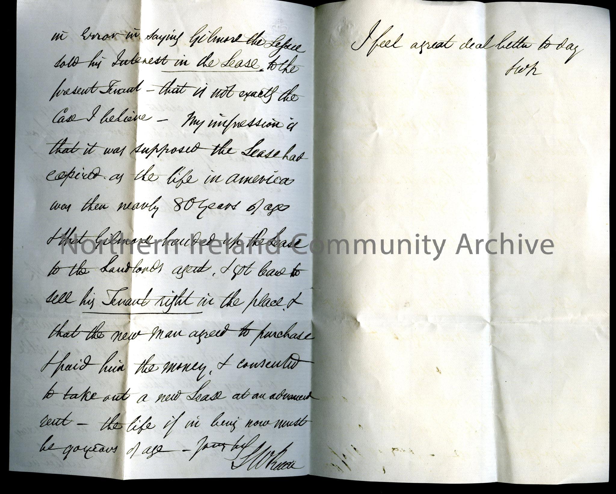 Handwritten letter to 'Crookshank'. Requests that Crookshank sends on an enclosed letter to a 'Miss Richardson' and discusses issues with a lease of land from 'John Hezlet' to a new tenant, after 'the death of old Gilmore'. Appears to be confusion or dispute over the current holder of the lease. Sender unknown, but letter addressed from 'Newry'.