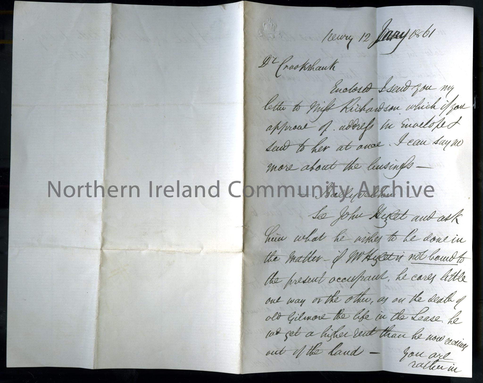 Handwritten letter to 'Crookshank'. Requests that Crookshank sends on an enclosed letter to a 'Miss Richardson' and discusses issues with a lease of land from 'John Hezlet' to a new tenant, after 'the death of old Gilmore'. Appears to be confusion or dispute over the current holder of the lease. Sender unknown, but letter addressed from 'Newry'.