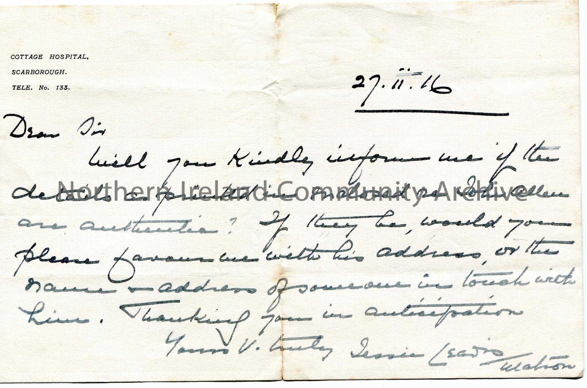 Handwritten letter to ‘Dear Sir’. Asks Sam to confirm if details re John Allen are authentic and for a way to get in touch with him.