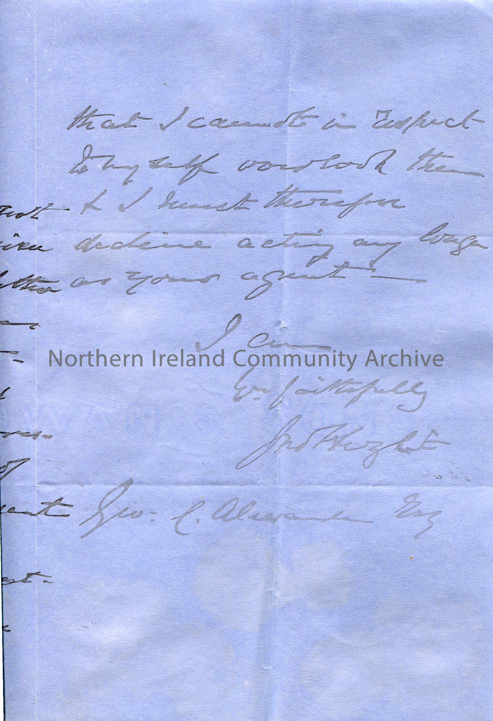 Handwritten letter to 'Dear Sir'. Is sending information re accounts. They did not mean to cause offence in a previous letter sent. Mentions kind words of their father. Declare that they no longer wish to act as the recipients agent due to the latest letters he has been sent.