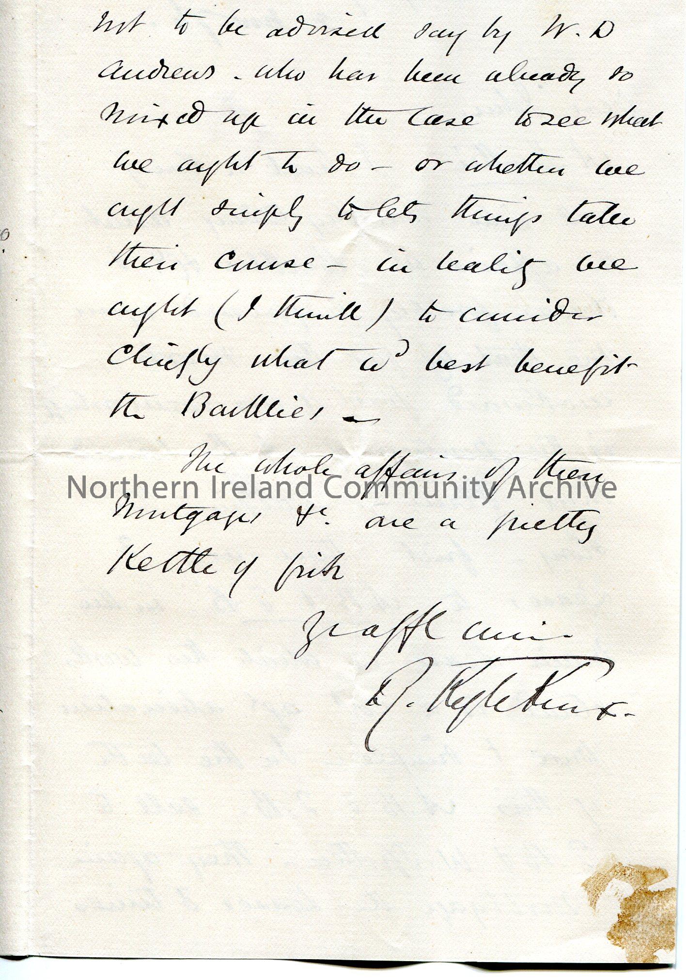 Handwritten letter to John. (Folded and written on four sides). Writing re a number of property and mortgages which are not straightforward. – scan014d