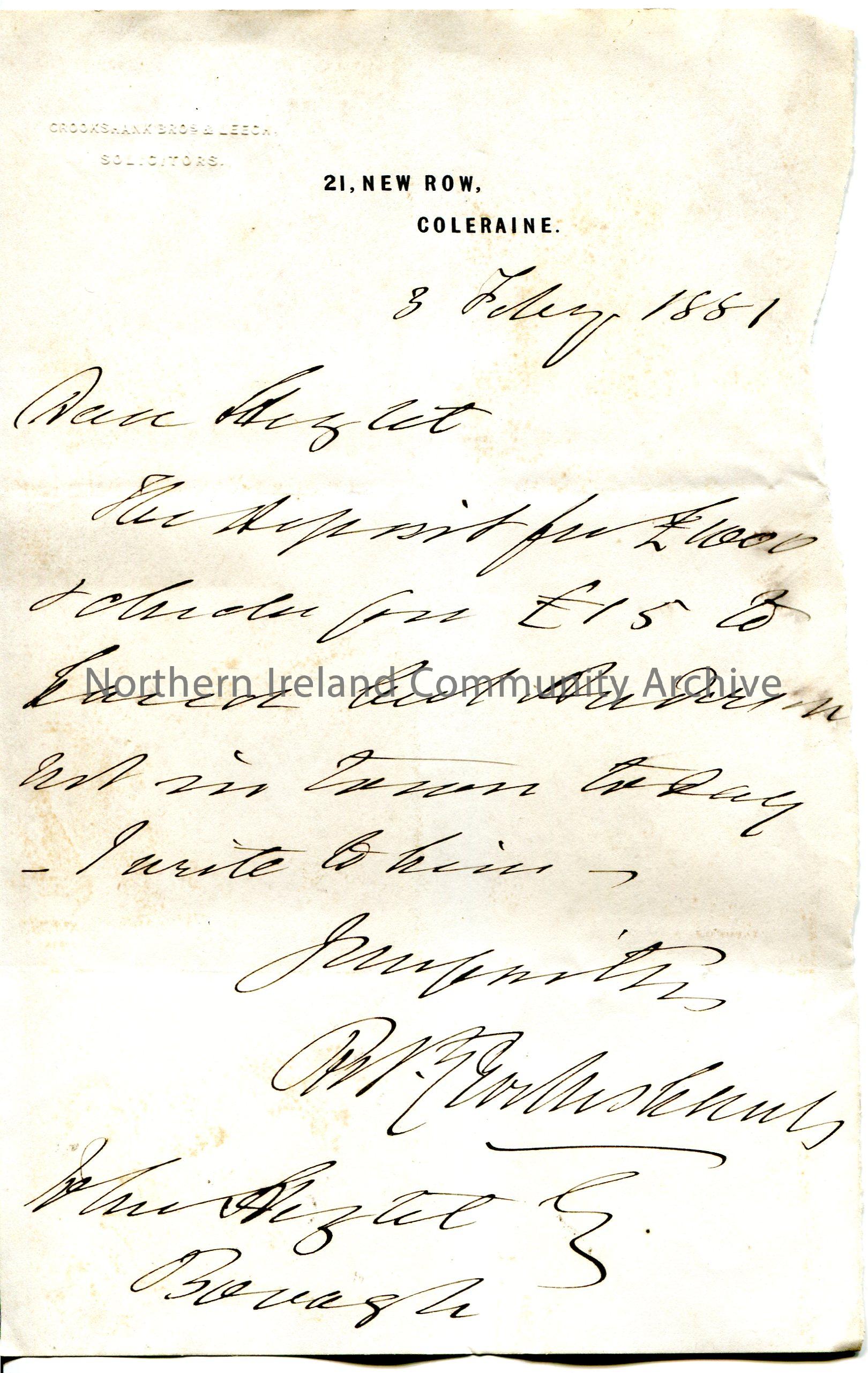 Handwritten letter to John Hezlet, Bovagh. Mentions a deposit of £1000 and a cheque for £15.