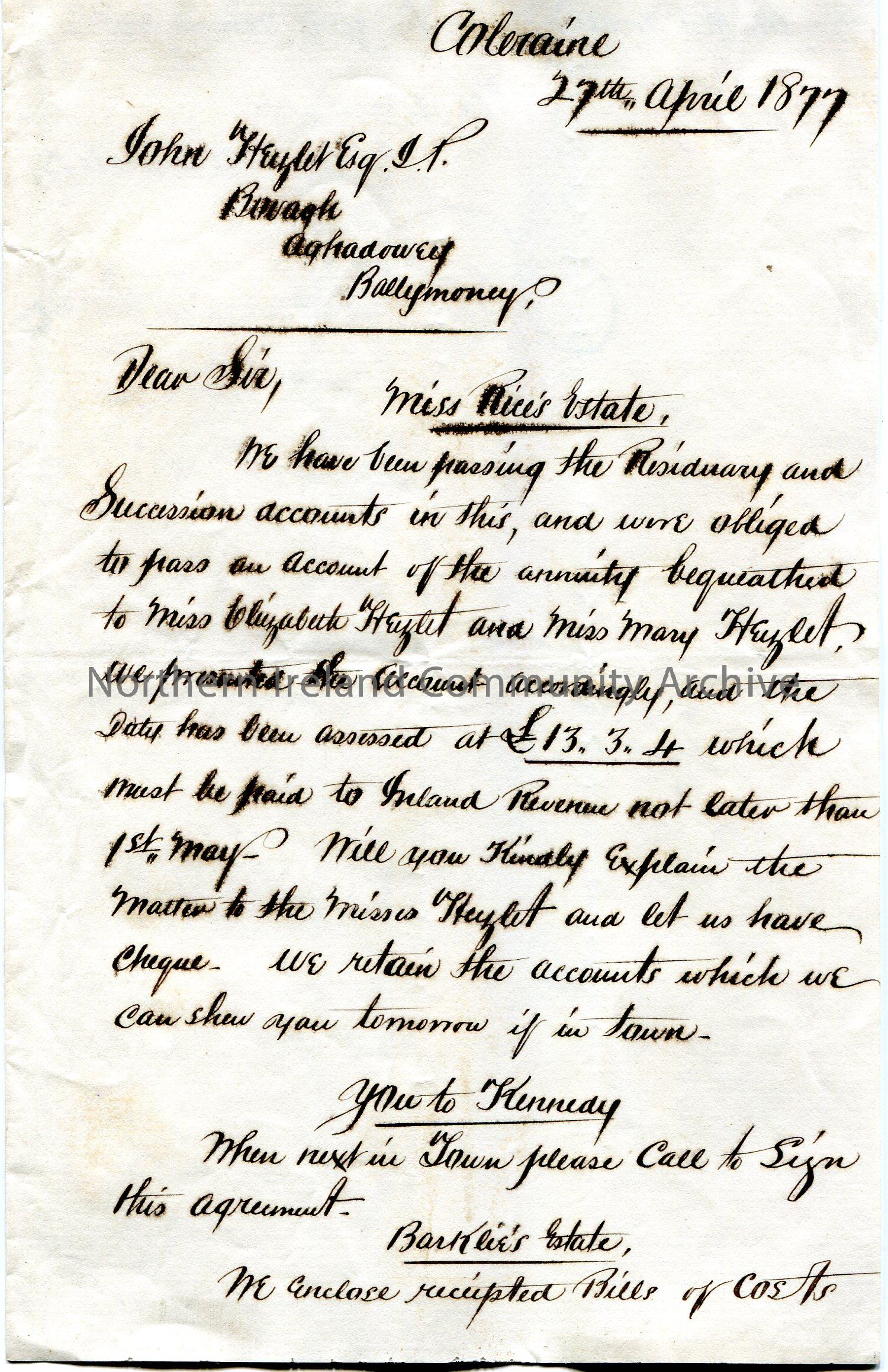 Handwritten letter to John Hezlet Esq, Bovagh, Aghadowey, Ballymoney. (Folded and written on two sides). Writing re Miss Rice's Estate. Asking for a cheque for Duty for the sum of £13.3.4 to be paid to the Inland Revenue by Miss Elizabeth Hezlet and Miss Mary Hezlet. Also writes to an agreement with Kennedy and Barklie's Estate.