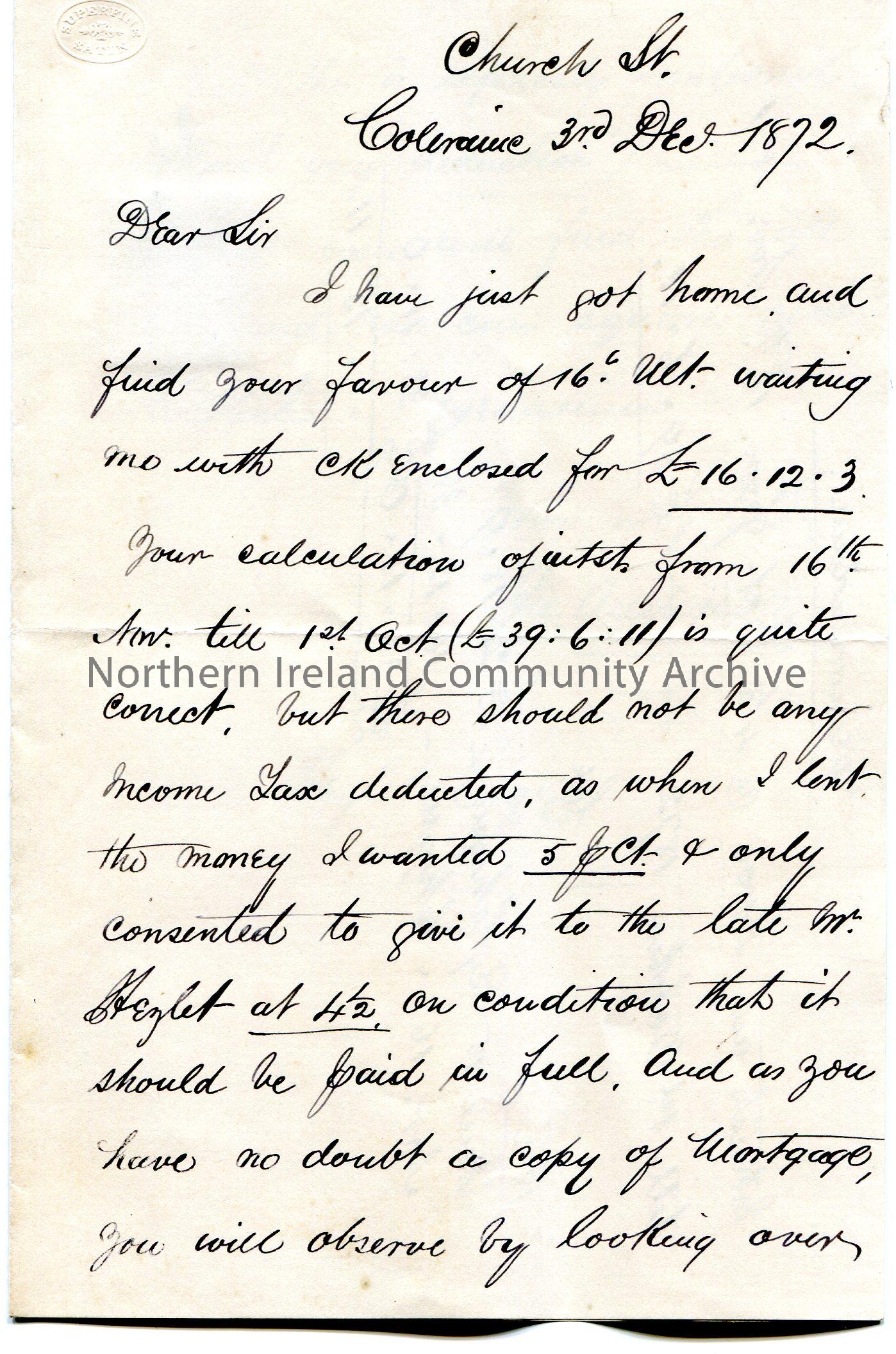 Handwritten letter to John Hezlet Esq. (Folded page, written on two sides). Writing re money owed on a mortgage. Writes of thanks for cheque for money…