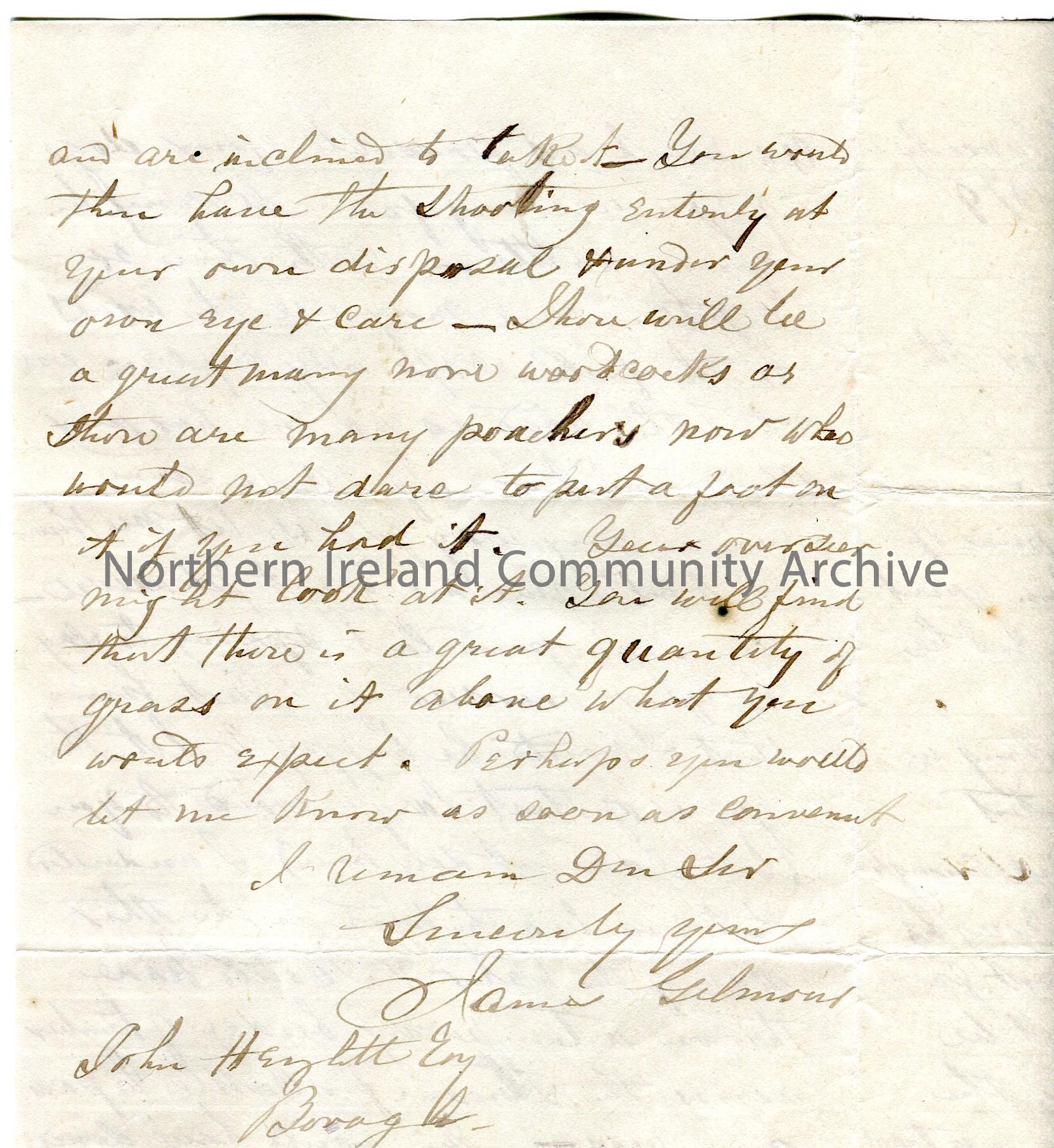 Handwritten letter to John Hezlett [Hezlet] Esq, Bovagh. (Folded and written on three sides on lined paper). Encloses receipt for £10.10.0. Writes re the renting of property and they have let a piece of grass land to Mr Millikin until 1st May 1880. Mentions shooting and poaching.