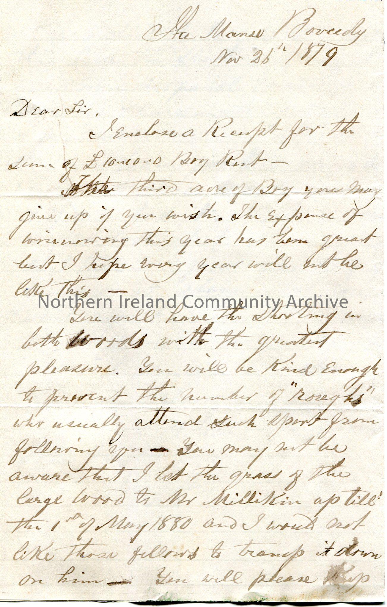 Handwritten letter to John Hezlett [Hezlet] Esq, Bovagh. (Folded and written on three sides on lined paper). Encloses receipt for £10.10.0. Writes re the renting of property and they have let a piece of grass land to Mr Millikin until 1st May 1880. Mentions shooting and poaching.