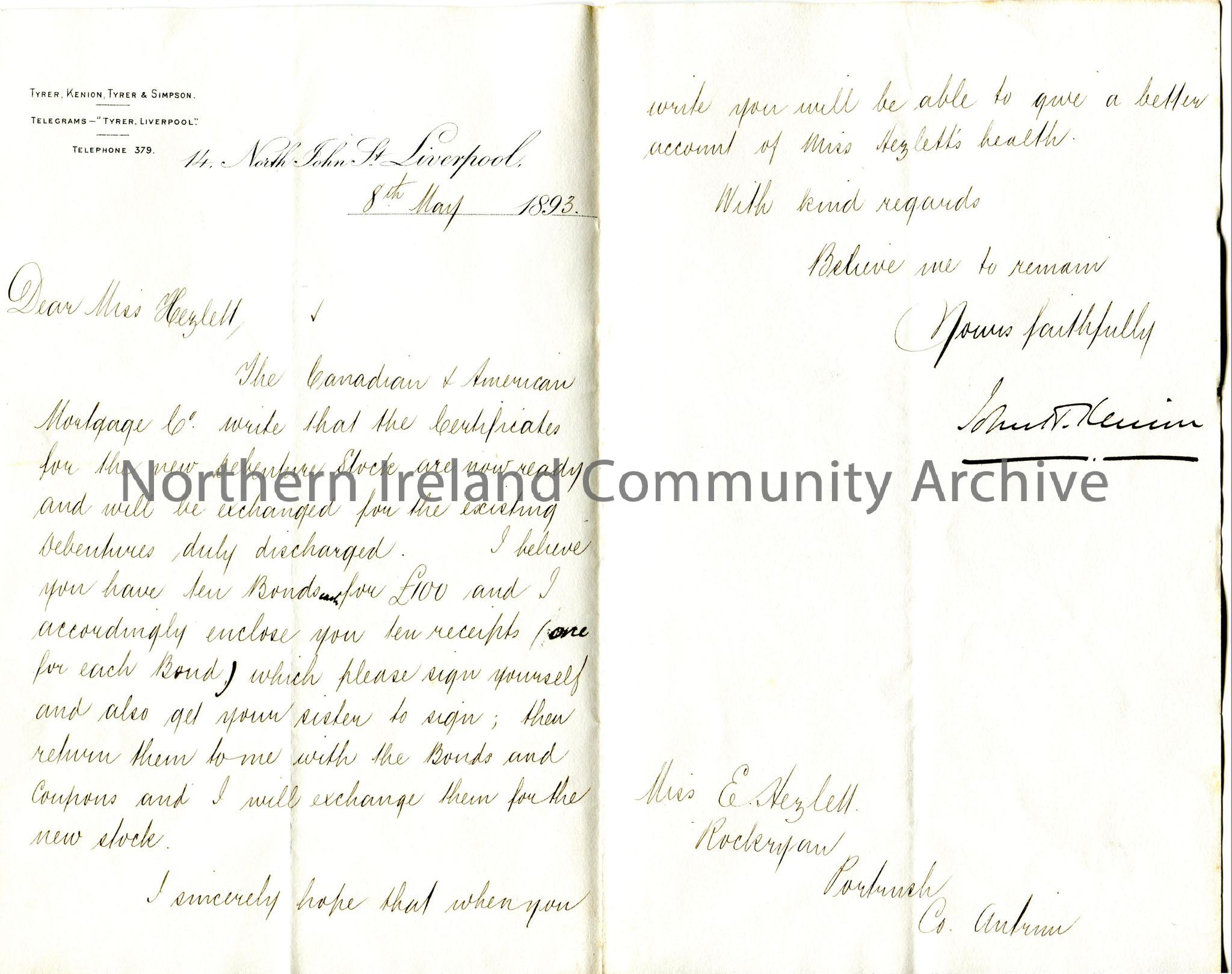 Handwritten letter to Miss E. Hezlet at Rockryan, Portrush, Co.Antrim. Informs Miss Hezlet that the Certificate for the new debenture Stock is ready i…