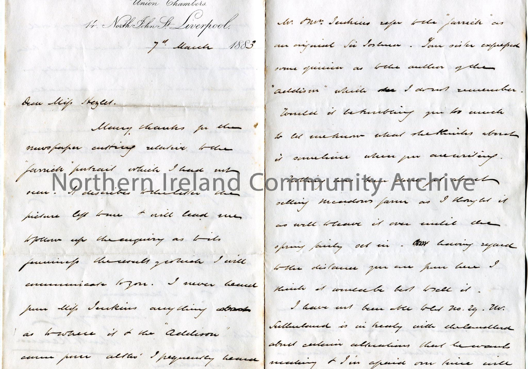 Handwritten letter to Miss Hezlet at Bovagh, Aghadowey, Co. Derry. Thanks Miss Hezlet for newspaper cutting re 'Farrich' ? portrait. He had never heard from Miss Jenkins where it or the 'Addison' came from. Writes re the selling of M...s ? farm. Also writes that Mr Sparrow and Miss Mary Know have been paid in cash. Mentions a Miss/Mrs Crookshank of Coleraine. Comments on his family's health and the weather. Refers to the Yankees.