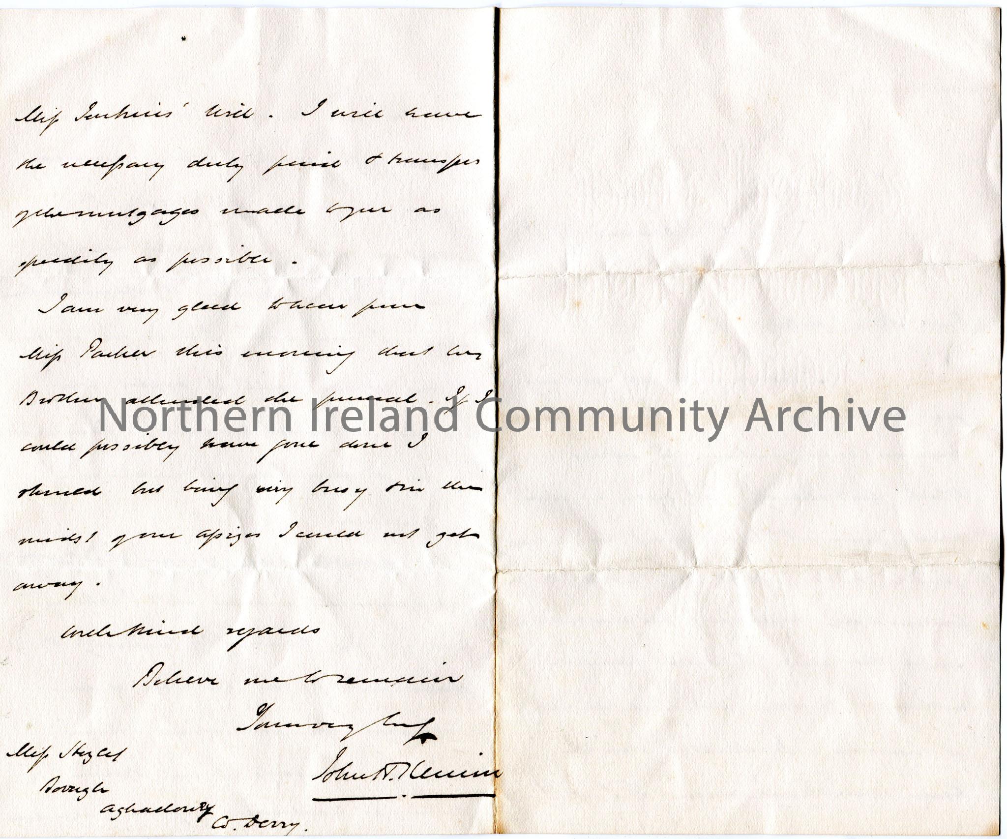 Handwritten letter to Miss Hezlet at Bovagh, Aghadowey, Co. Derry. Writing re the death of Roberts. – scan344b
