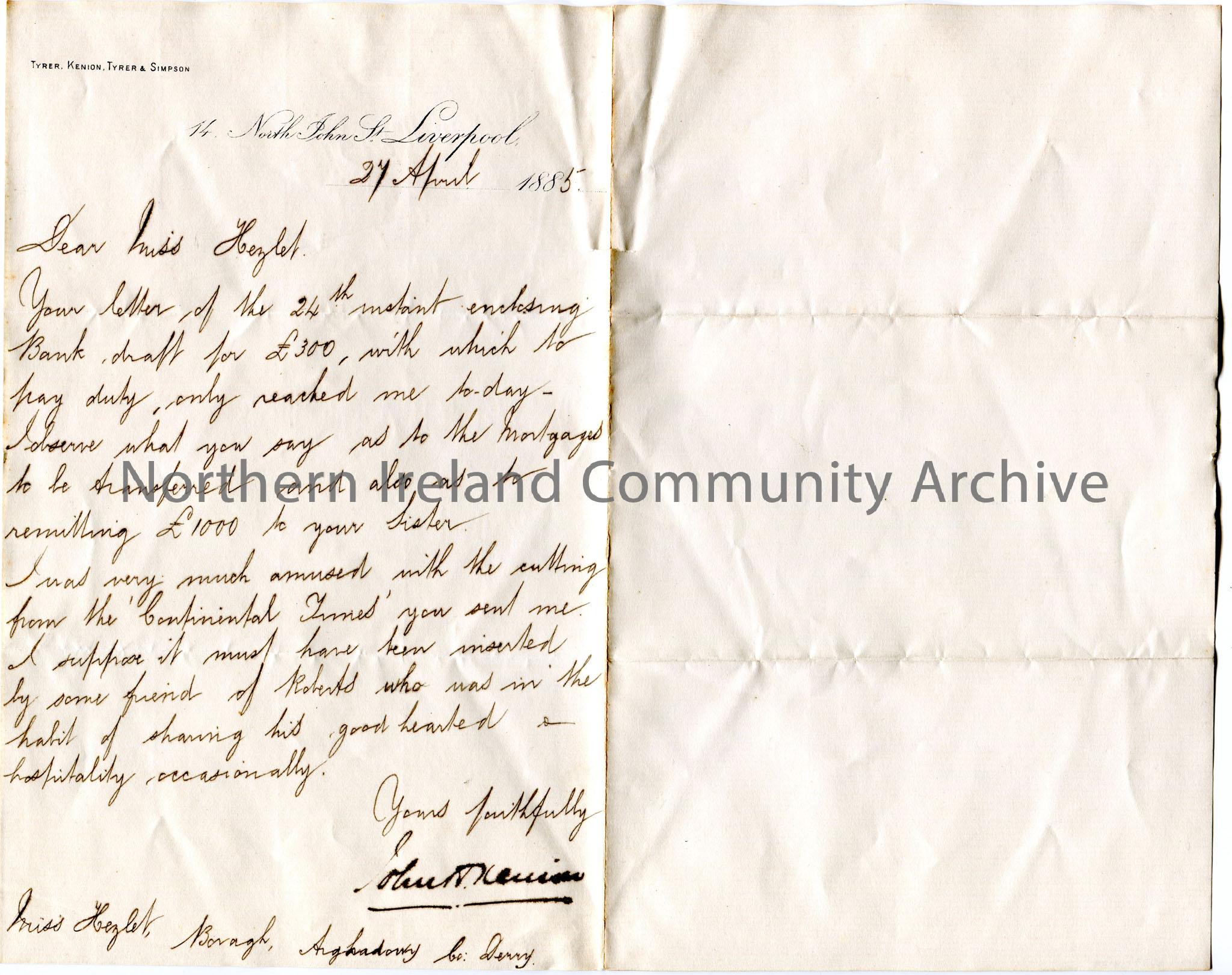 Handwritten letter to Miss Hezlet at Bovagh, Aghadowey, Co.Derry. Informs Miss Hezlet that he has received a bank draft for £300. £1000 to be remitted to Miss Hezlet's sister. Refers to a cutting from the 'Continental ...?' which mentions Robert. Kenion writes that he came across as good hearted and hospitable.