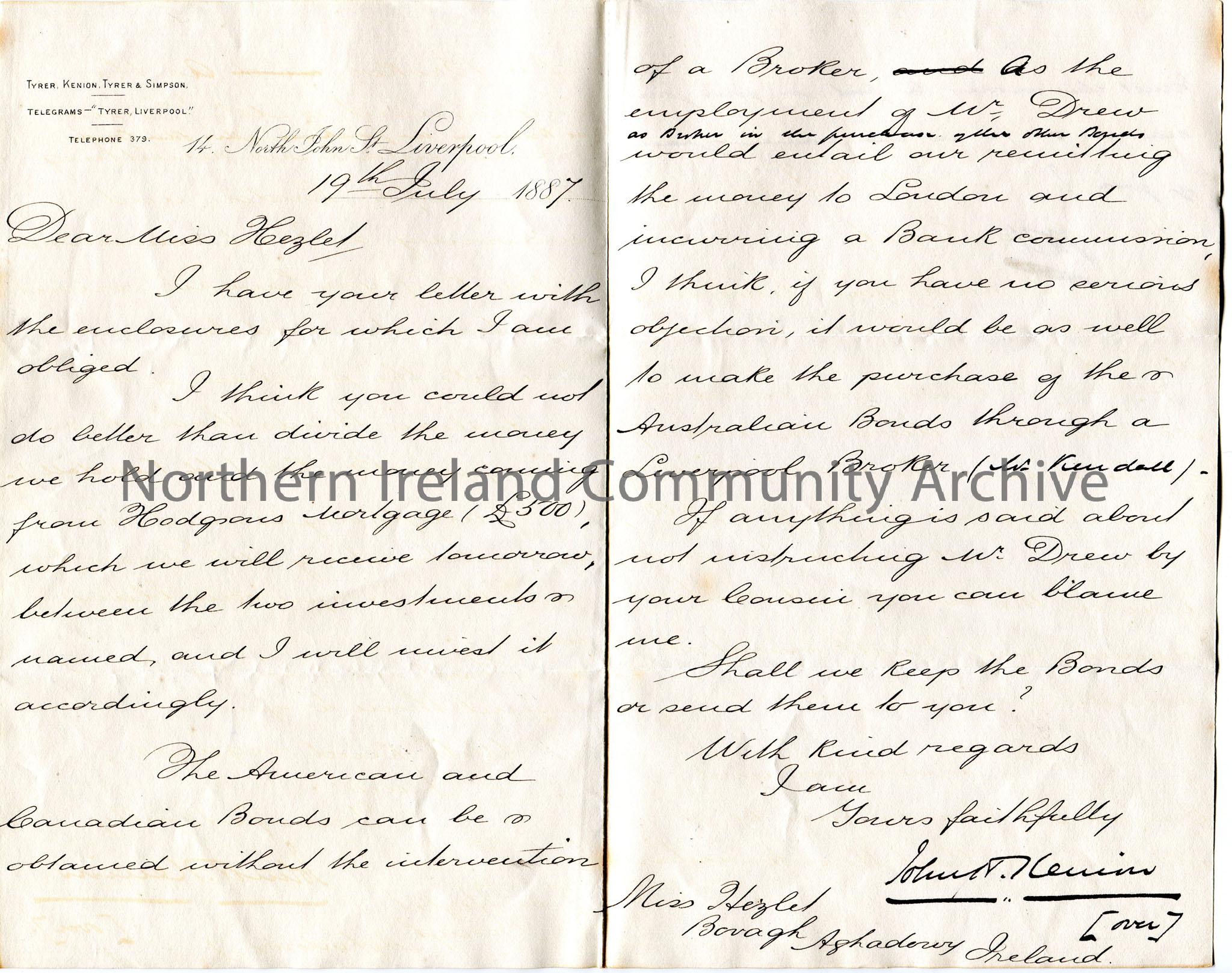 Handwritten letter to Miss Hezlet at Bovagh, Aghadowey, Ireland. Agrees with Miss Hezlet on her instructions for investing money. Advises Miss Hezlet …