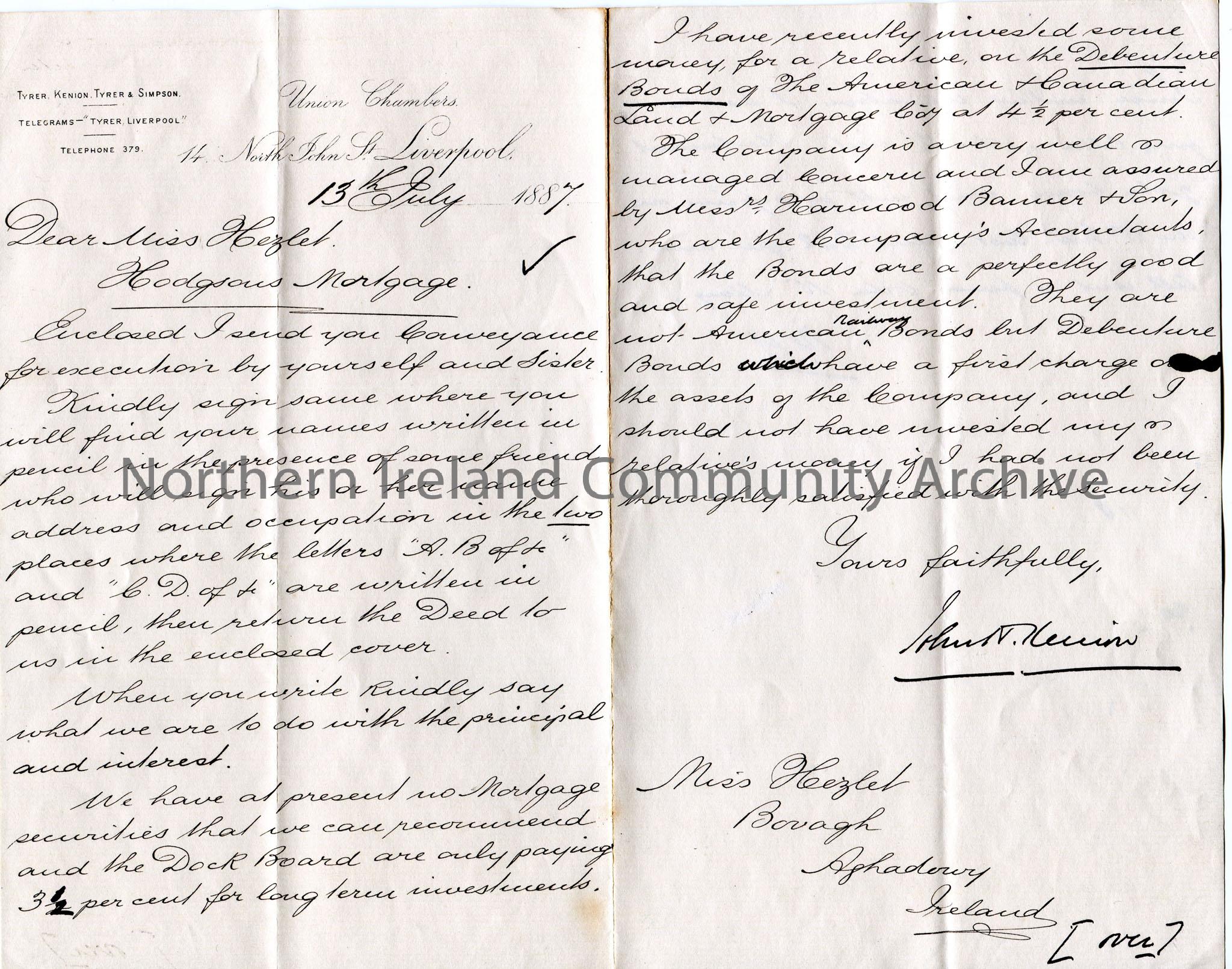 Handwritten letter to Miss Hezlet at Bovagh, Aghadowey, Ireland. Writing re Hodgson's mortgage. Encloses conveyance for execution by Miss Hezlet and her sister. Informs Miss Hezlet there are no mortgage securities at the present time. Suggests investing in Debenture Bonds of the American and Canadian Land and Mortgage Company. Adds a note on the reverse re rental of a property.