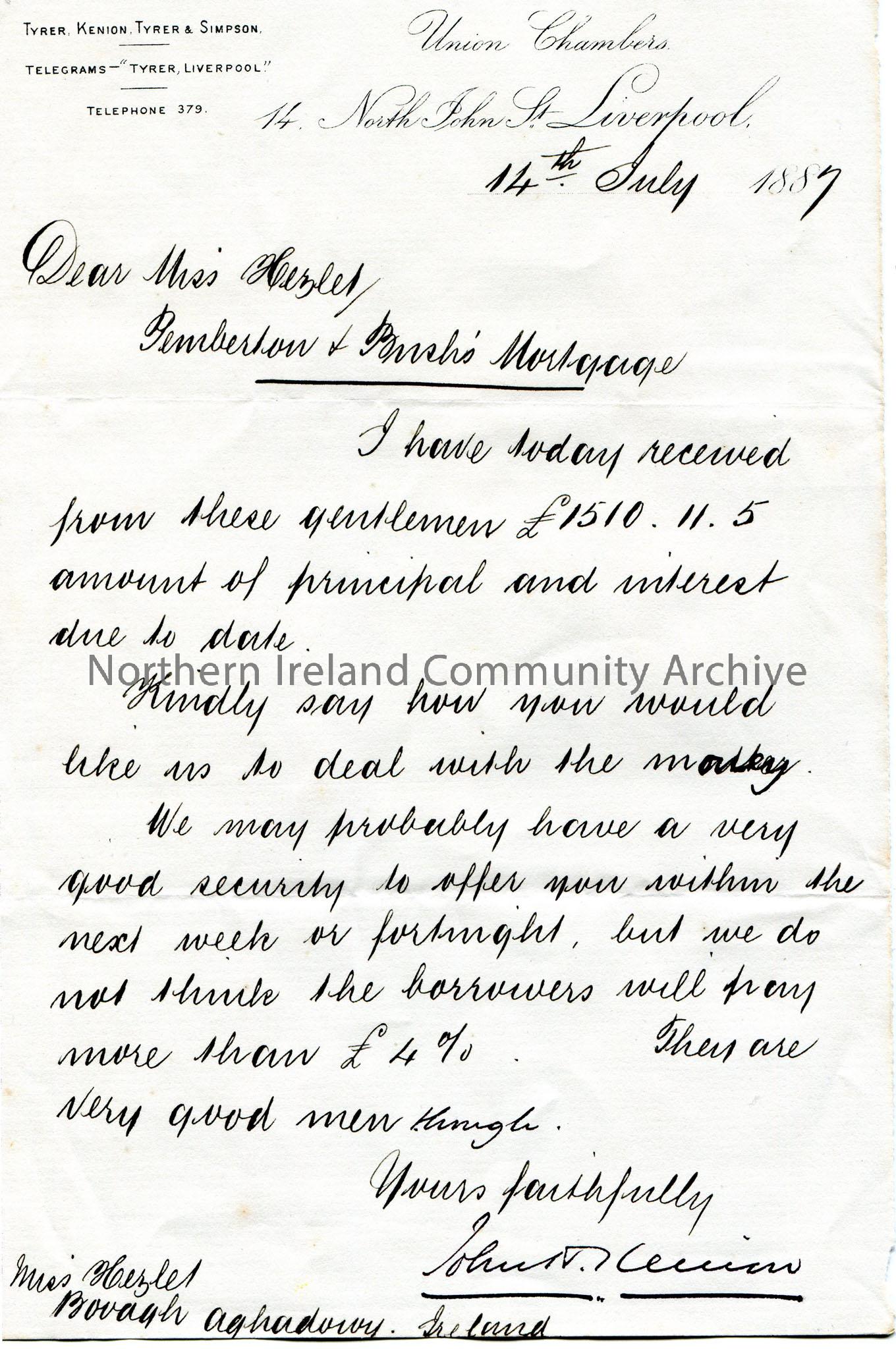 Handwritten letter to Miss Hezlet at Bovagh, Aghadowey, Ireland. Writing re Pemberton and Bush's mortgage. Informs Miss Hezlet he has received the principle and interest of £1510.11.5. Miss Hezlet to inform Kenion what to do with the money. Tells Miss Hezlet of a possible investment for the money but does not give details.
