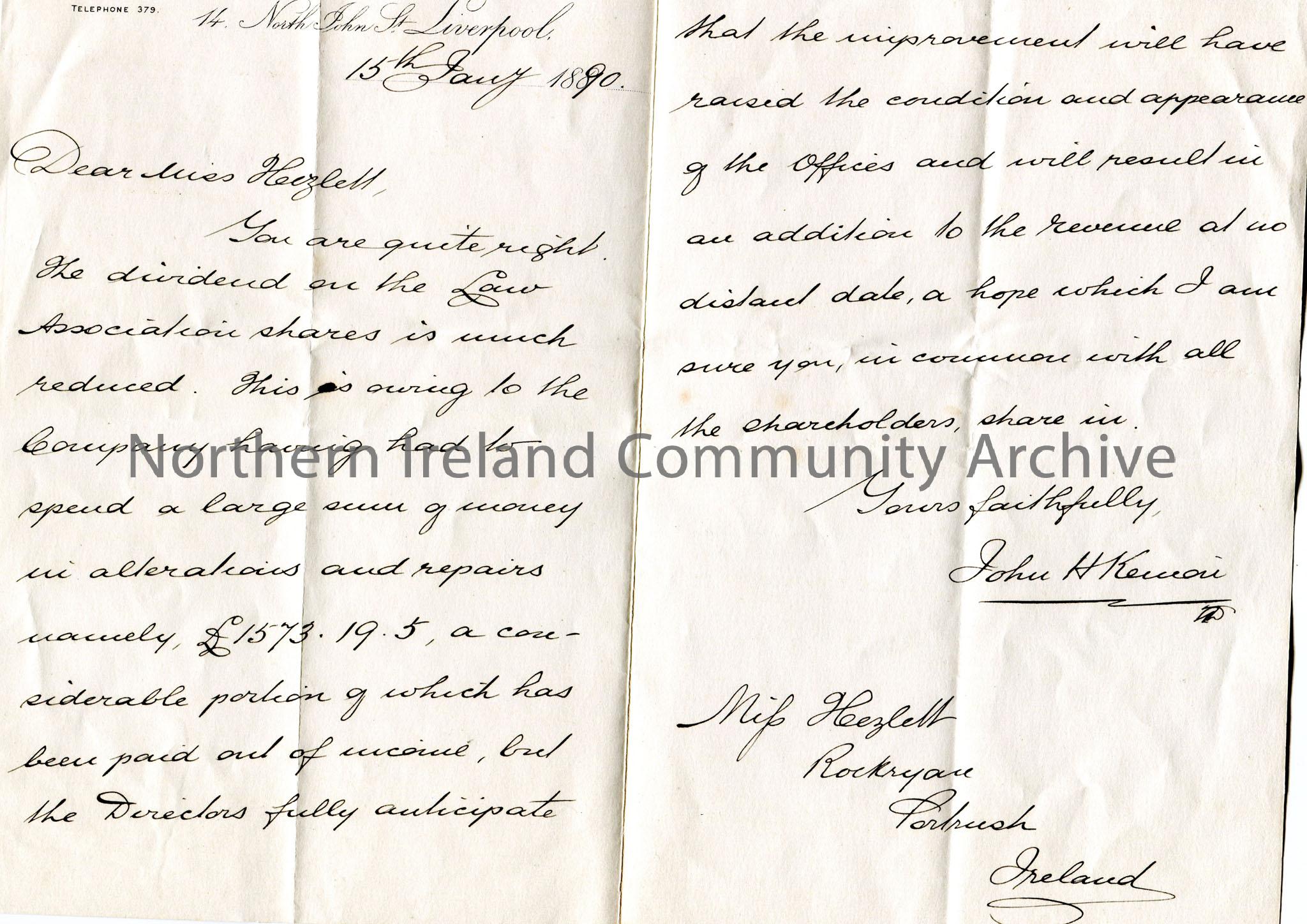 Handwritten letter to Miss Hezlet at Rock Ryan, Portrush, Ireland. Writing re the dividend on the Law Association shares which has reduced owing to repairs and alterations at a cost of £1573.19.5.
