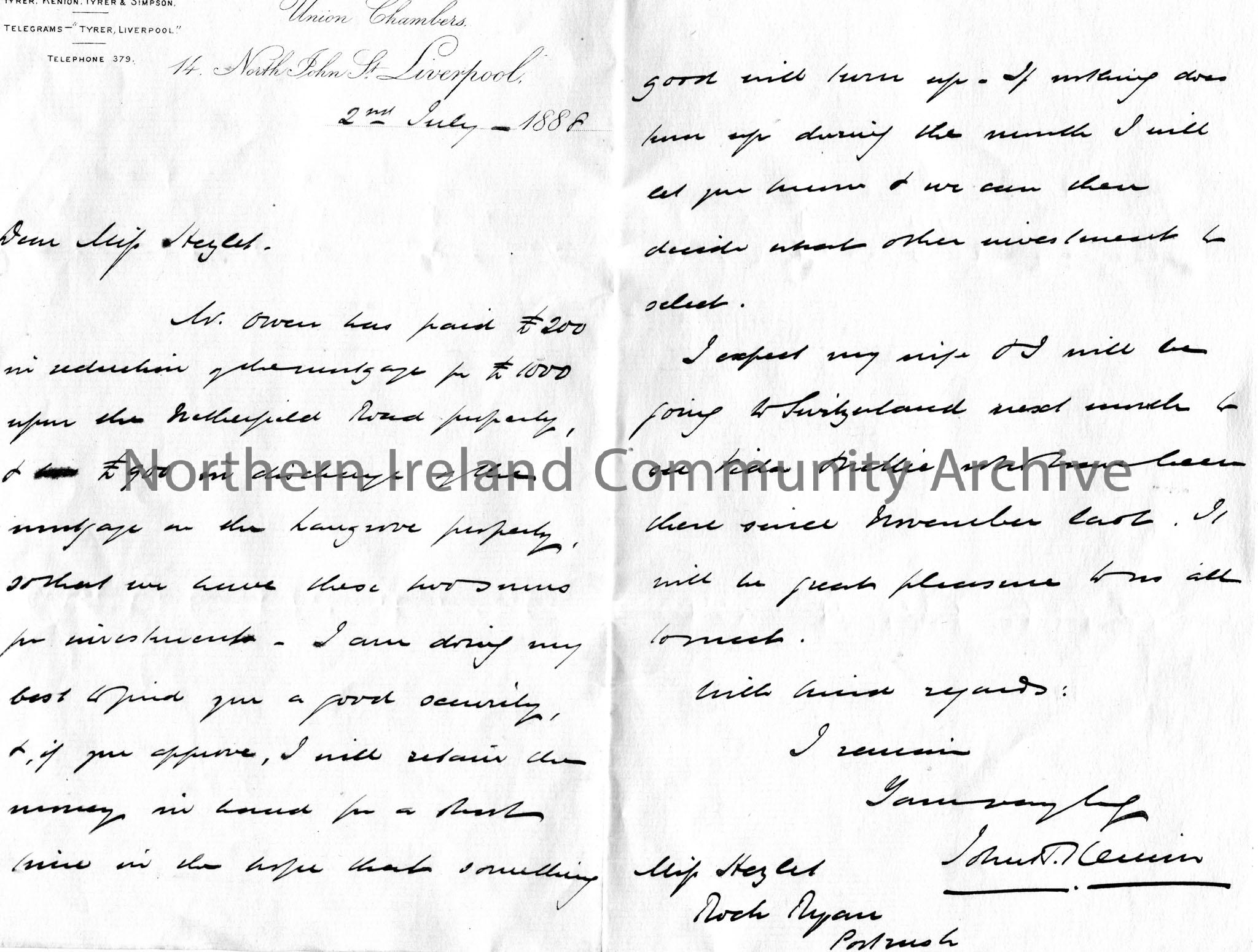 Handwritten letter to Miss Hezlet at Rock Ryan, Portrush. Mr Owen has paid £200. Kenion is currently finding good security for Miss Hezlet’s mone…