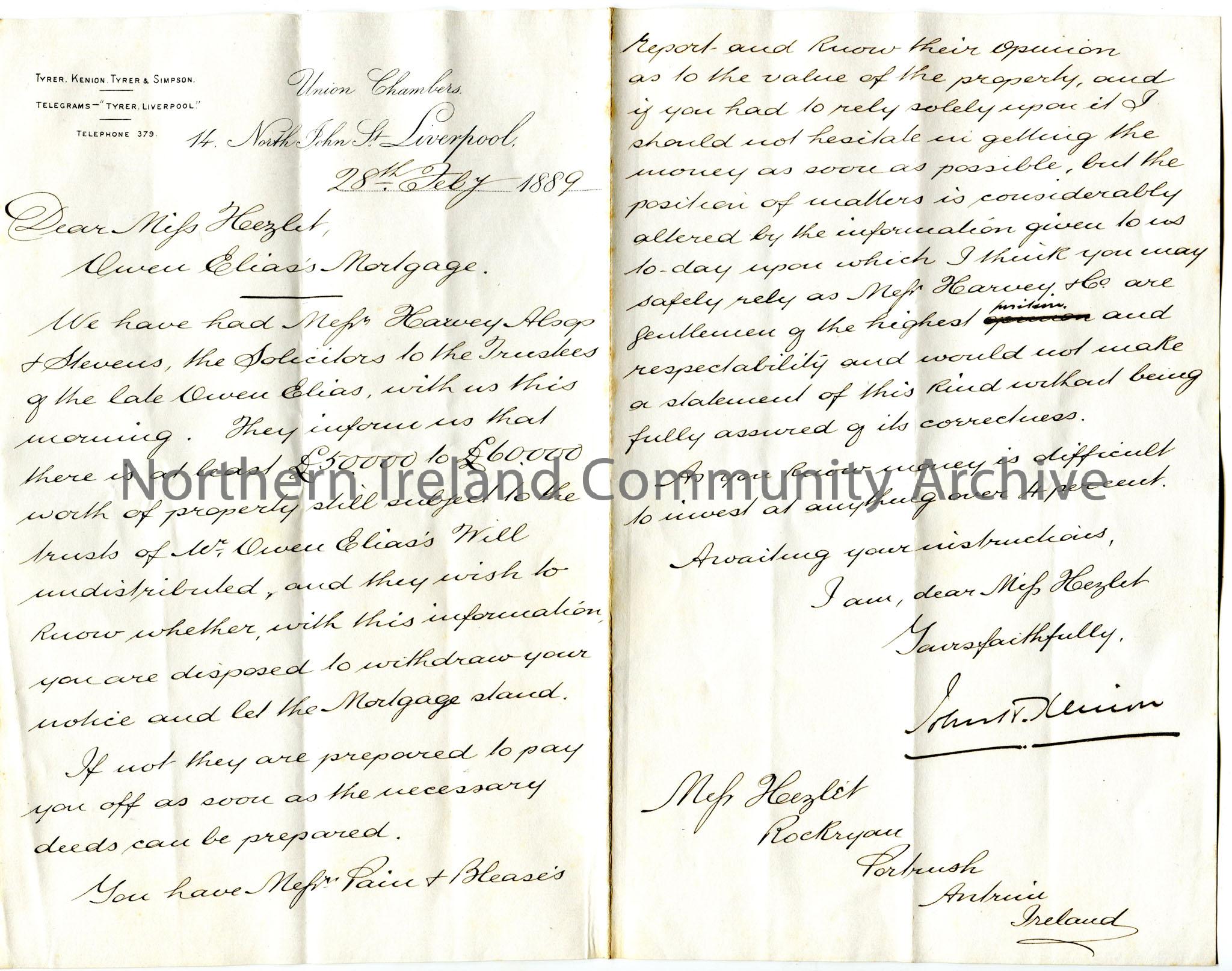 Handwritten letter to Miss Hezlet at Rockryan, Portrush, Antrim, Ireland. Writing re Owen Elias's Mortgage. Informing Miss Hezlet that the solicitors of the late Owen Elias, Mr Harvey Alsop and Stevens, would like to know if she is willing to let the Mortgage stand. Kenion thinks highly of the solicitors and believes their intentions to be safe. Miss Hezlet to instruct Kenion what to do with the money.
