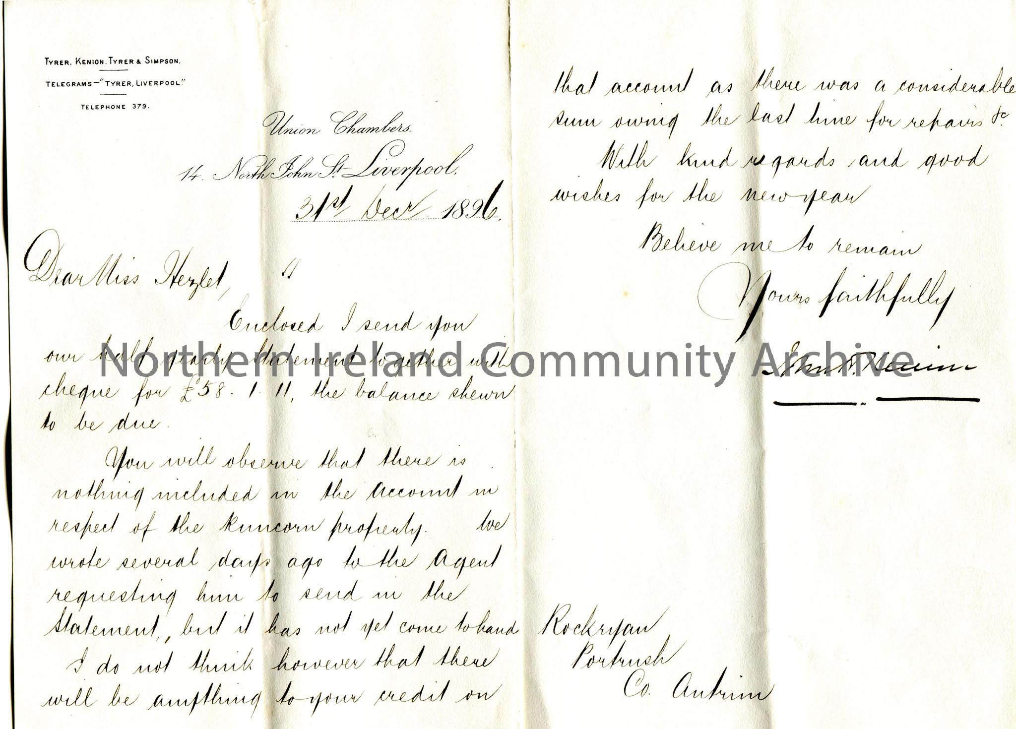 Handwritten letter to Miss Hezlet at Rockryan, Portrush, Co. Antrim. Encloses half yearly statement and cheque for £58.1.11. There is no information in the accounts re the property at Runcorn. Miss Hezlet may not be owed anything from that account.