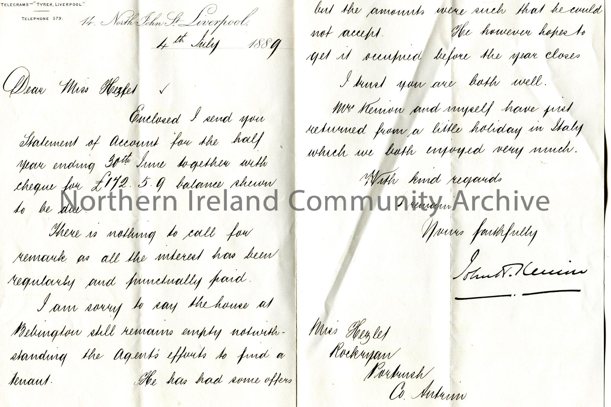 Handwritten letter to Miss Hezlet at Rockryan, Portrush, Co.Antrim. Encloses half yearly statement of accounts and a cheque for £172.5.9. The house at Bebington remains empty. Comments that himself and his wife enjoyed a holiday to Italy.