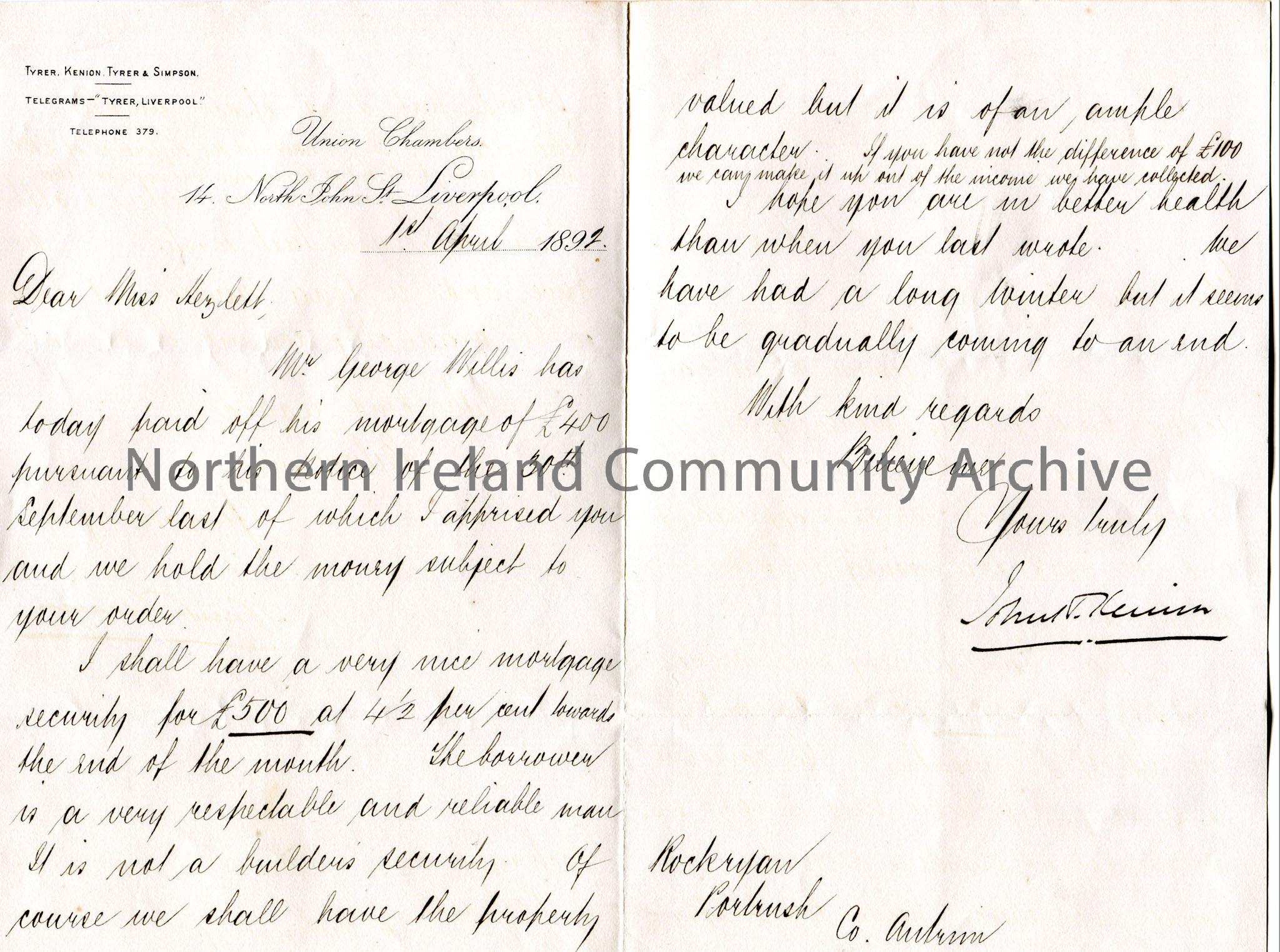 Handwritten letter to Miss Hezlet at Rockryan, Portrush, Co.Antrim. Re mortgage of Mr George Wallis. Informs Miss Hezlet of a prospective £500 mo…