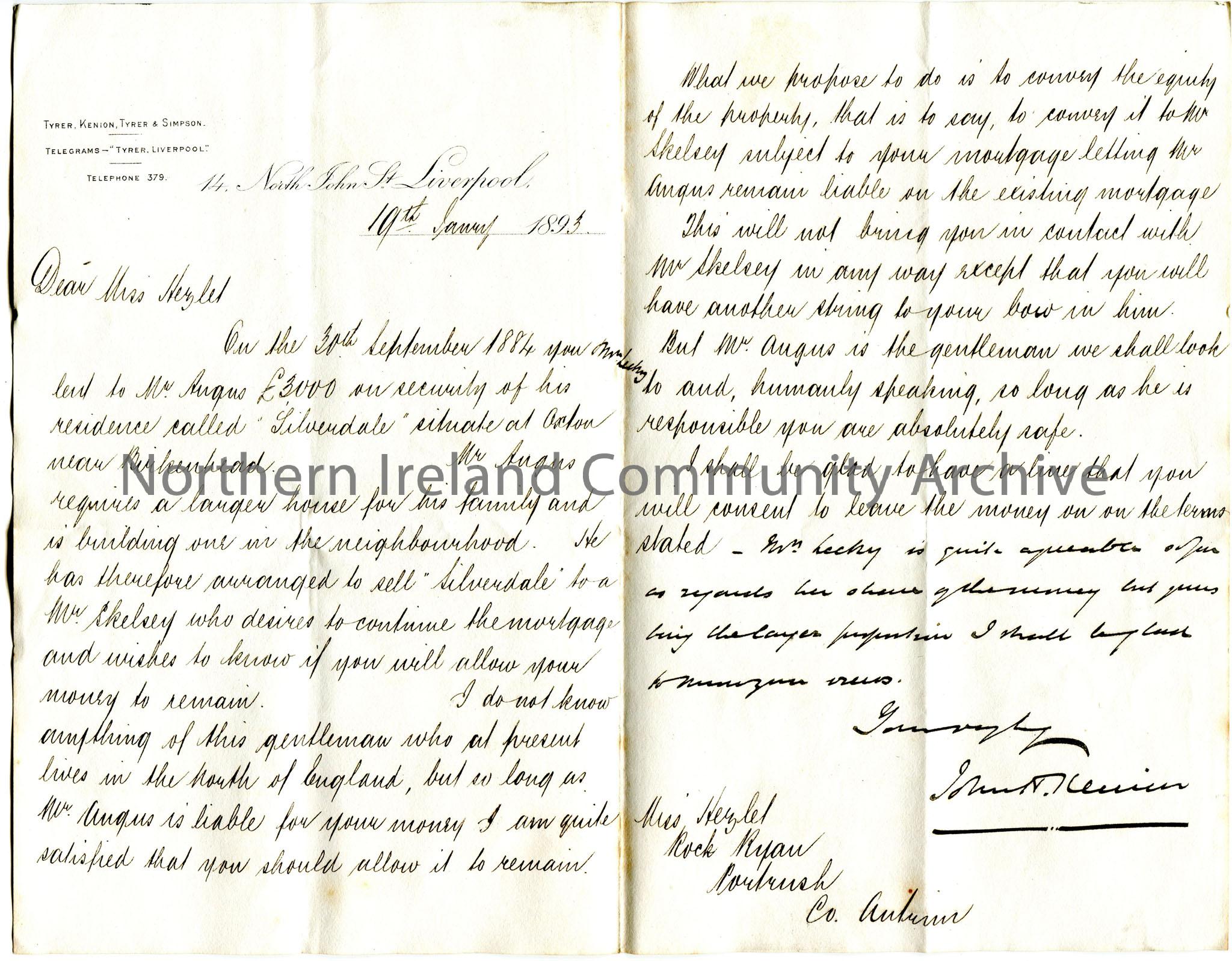 Handwritten letter to Miss Hezlet at Rockryan, Portrush, Co.Antrim. Writing re the proposal of Mr Angus to sell the property 'Silverdale' to Mr Skelsey. Miss Hezlet and Mrs Lecky lent Mr Angus £3000 on security of his residence and he wishes the money to remain. Kenion proposes to convey the equity to Mr Skelsey. Mrs Lecky is happy with her share of the money.