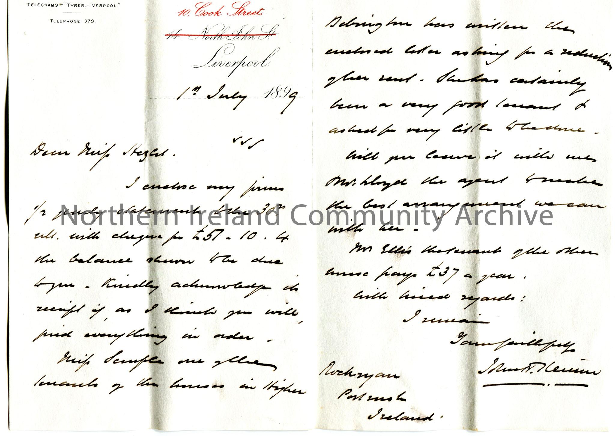 Handwritten letter to Miss Hezlet at Rockryan, Portrush. Encloses half yearly account statement and cheque for £57.10.4. Refers to a tenant of one of the houses in Higher Bebington, Miss Semple? in which she has been a very good tenant and to make arrangements with Mr Lloyd, the agent. Mrs Ellis, another tenant pays £37 per year.